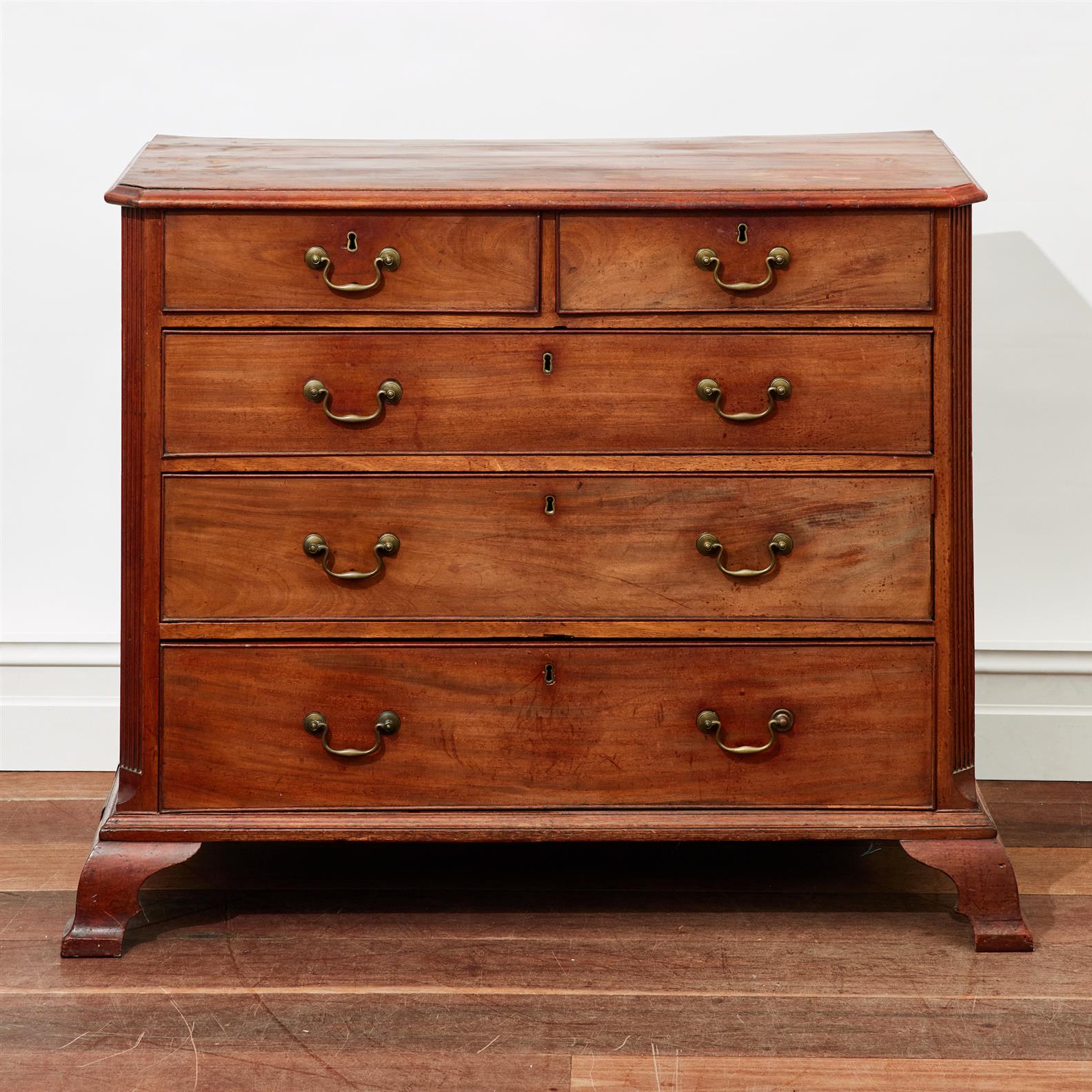 A GEORGE III MAHOGANY CHEST OF TWO SHORT ABOVE THREE LONG DRAWERS WITH CANTED FLUTED ANGLES AND OGEE BRACKET FEET
