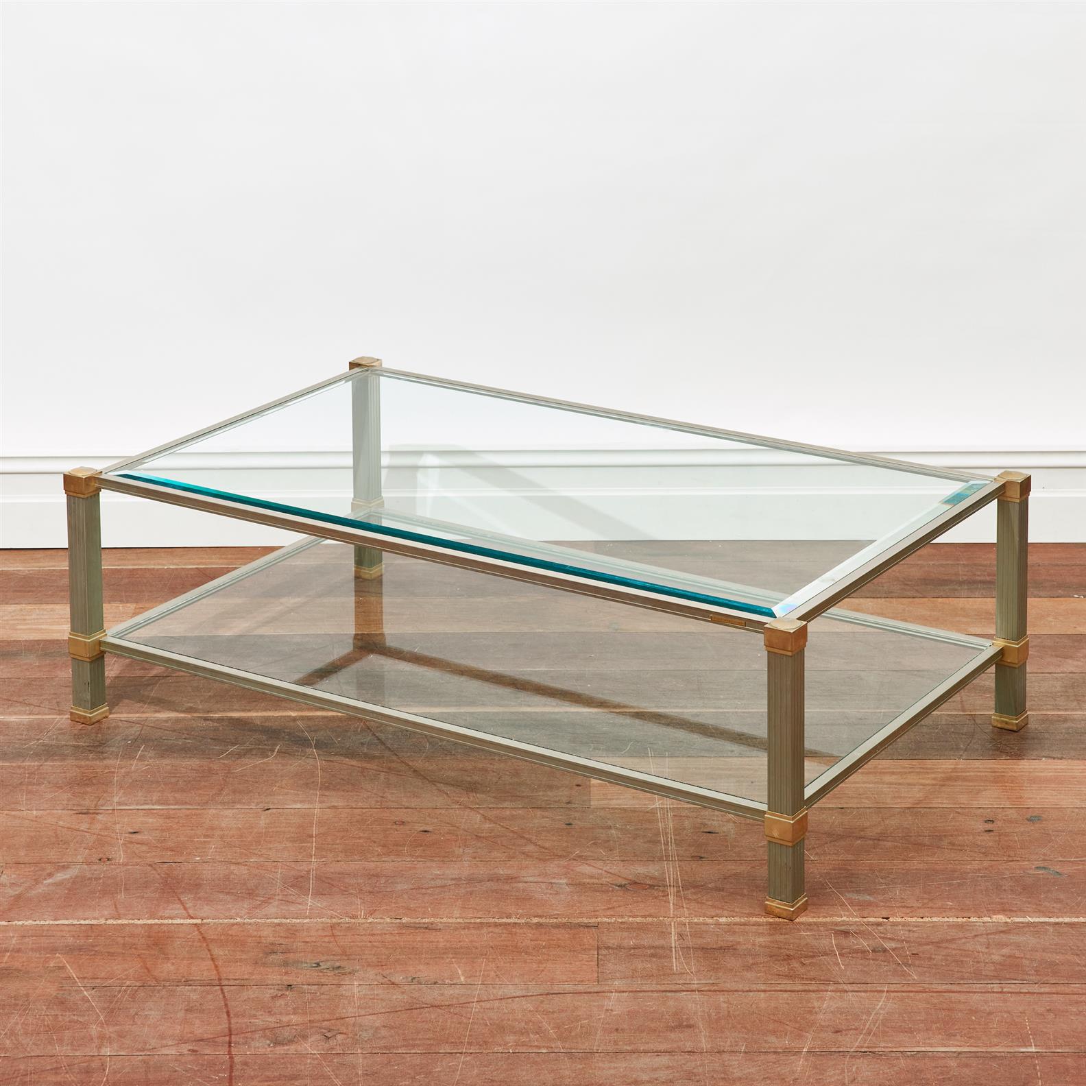 PIERRE VANDEL: COFFEE TABLE WITH GLASS TOP ON CHROMIUM AND GILT FLUTED SUPPORTS
