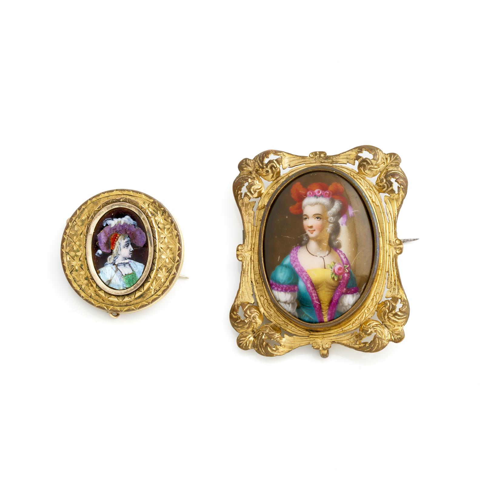 A PAIR OF ANTIQUE HAND PAINTED BROOCHES IN PINCHBECK AND GILT METAL, MEASURING 28 X 28MM AND 45 X 40MM