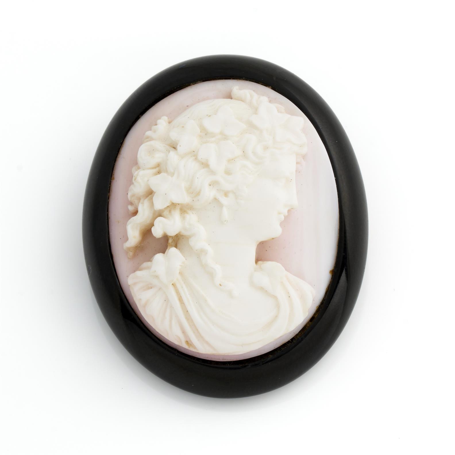 AN ANTIQUE CARVED CAMEO AND ONYX BROOCH, FEATURING A MAIDEN IN PROFILE, 4.5 X 3.7MM