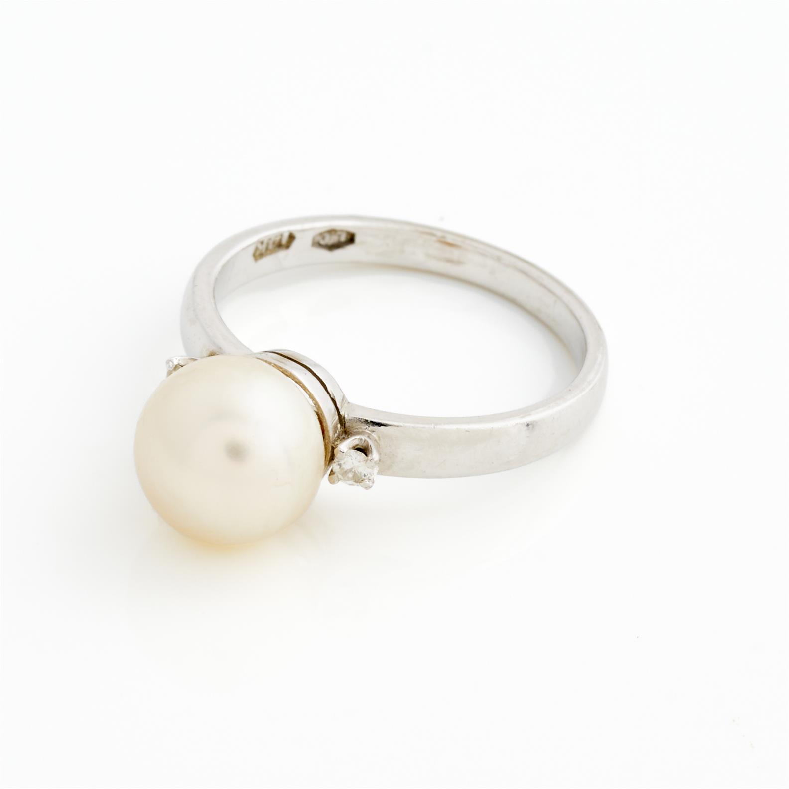 A DIAMOND AND PEARL RING IN 14CT WHITE GOLD, THE PEARL MEAUSRING 18.8MM, SIZE 1/2L, 3.3GMS