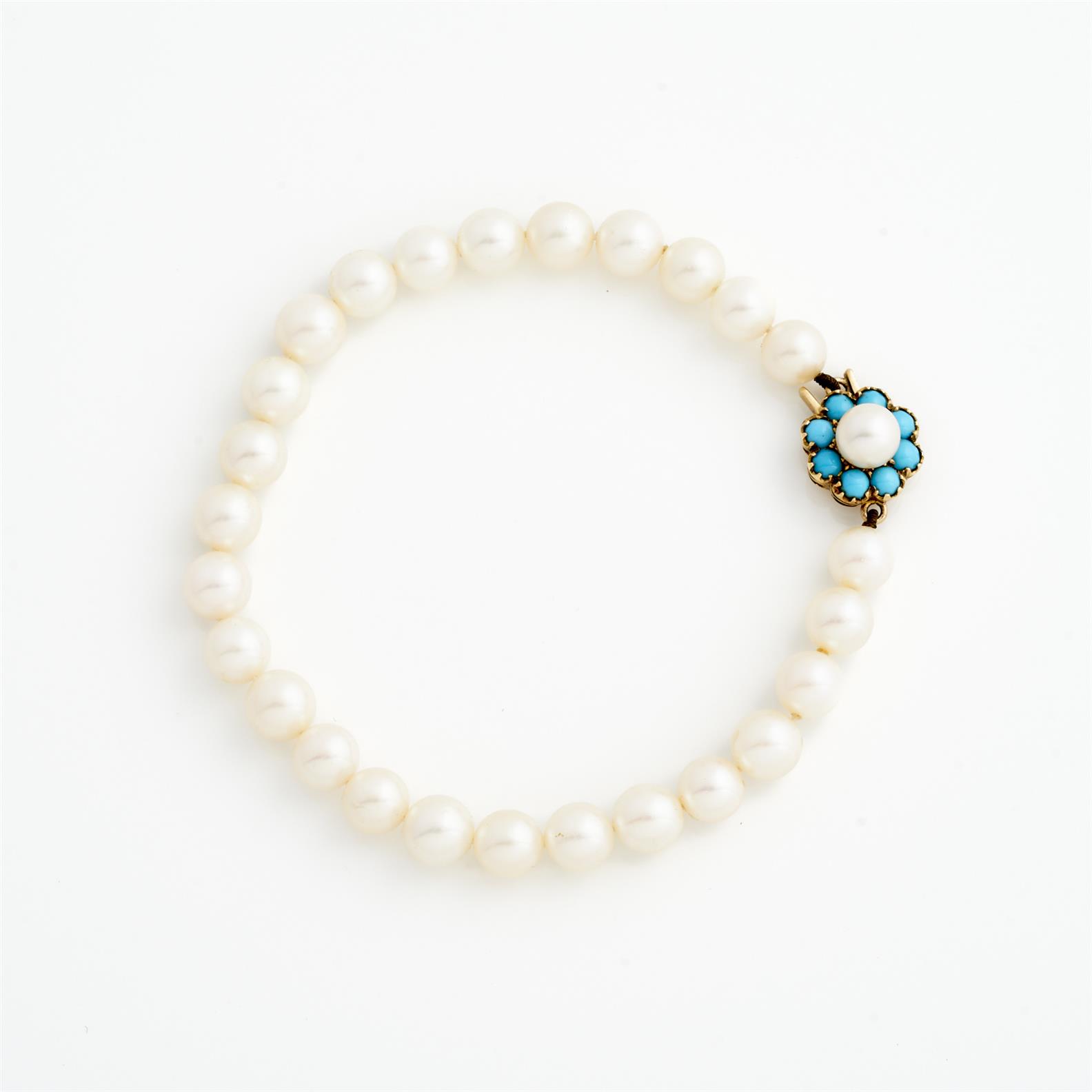 A CULTURED PEARL AND TURQUOISE BRACELET, THE PEARLS MEASURING 6.6 -6.9MM, 190MM