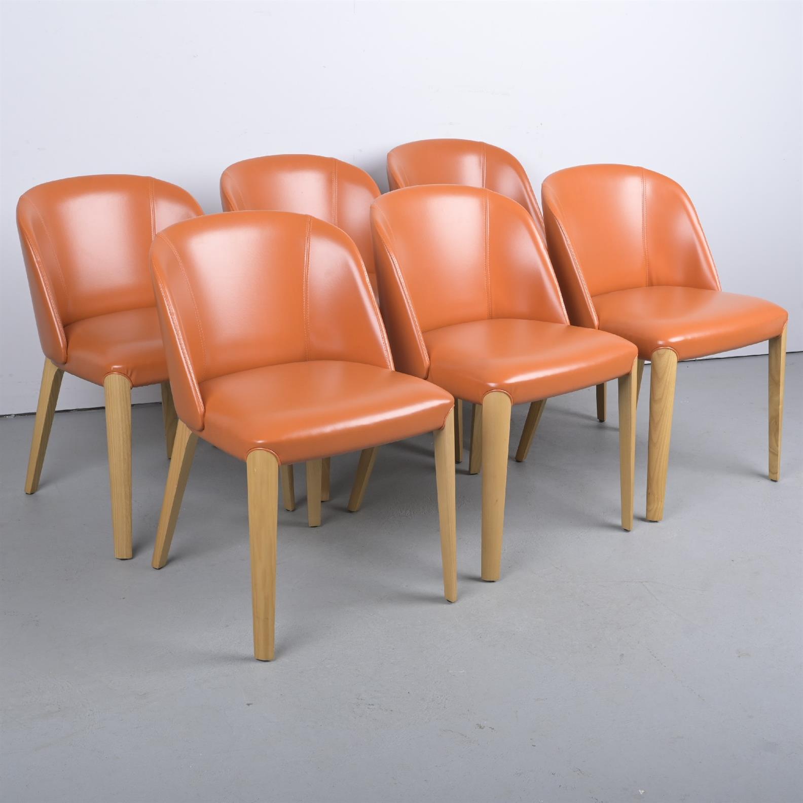 A SET OF SIX ASH AND VINYL UPHOLSTERED DINING CHAIRS BY THIS WEBER FOR VERYWOOD, ITALY (80H X 50W X 55D CM) (THIS ITEM MUST BE REMOVED BY CARRIERS AT THE CUSTOMER'S EXPENSE. LEONARD JOEL STAFF CANNOT ASSIST CARRYING THIS ITEM.)