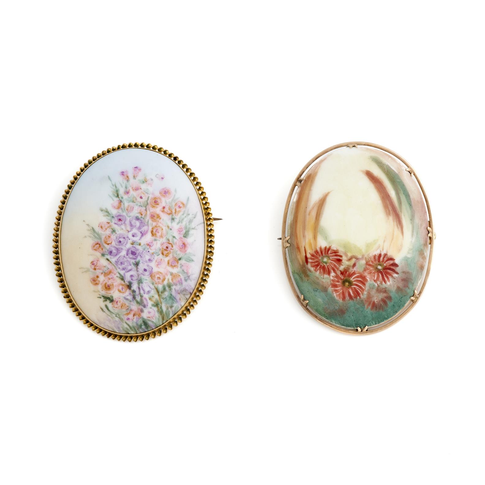 TWO HANDPAINTED BROOCHES IN 9CT GOLD, MEASURING 60 X 50MM AND 55 X 45MM