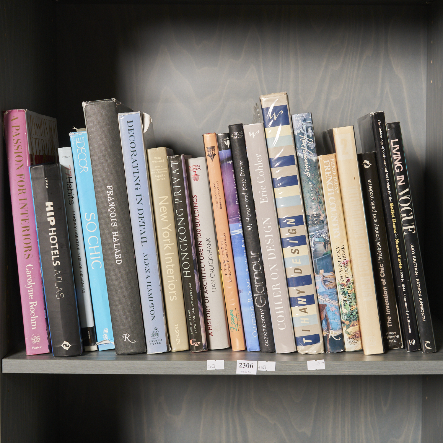 A SHELF OF DESIGN AND INTERIOR DECORATION REFERENCE INCLUDING FRANCOIS HALARD, COHLER ON DESIGN, TIHANY DESIGN, AND LIVING IN VOGUE