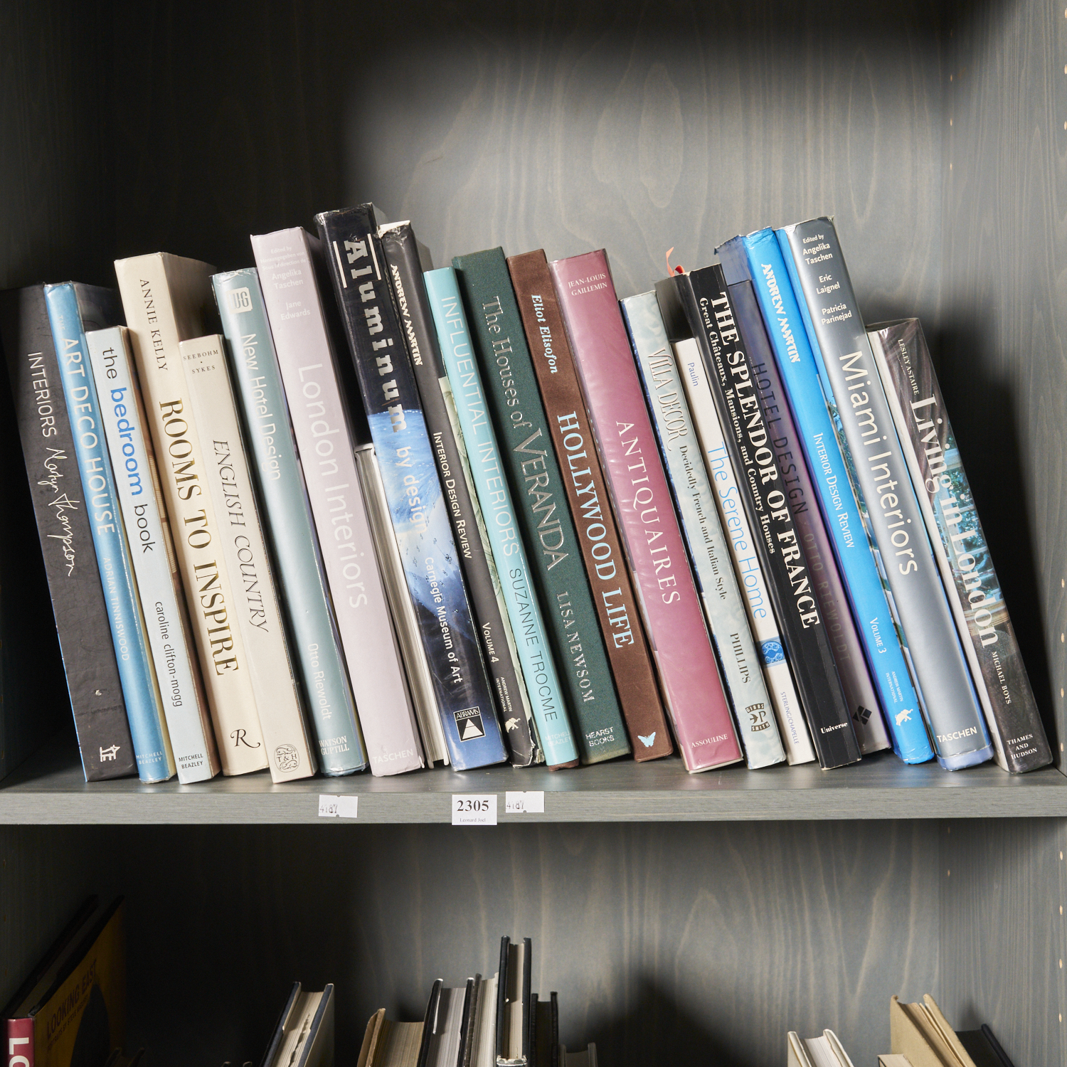 A SHELF OF DESIGN AND INTERIOR DECORATING REFERENCE INCLUDING ALUMINIUM BY DESIGN, INTERIORS - MARTIN THOMPSON, ANTIQUAIRES, AND HOLLYWOOD LIFE