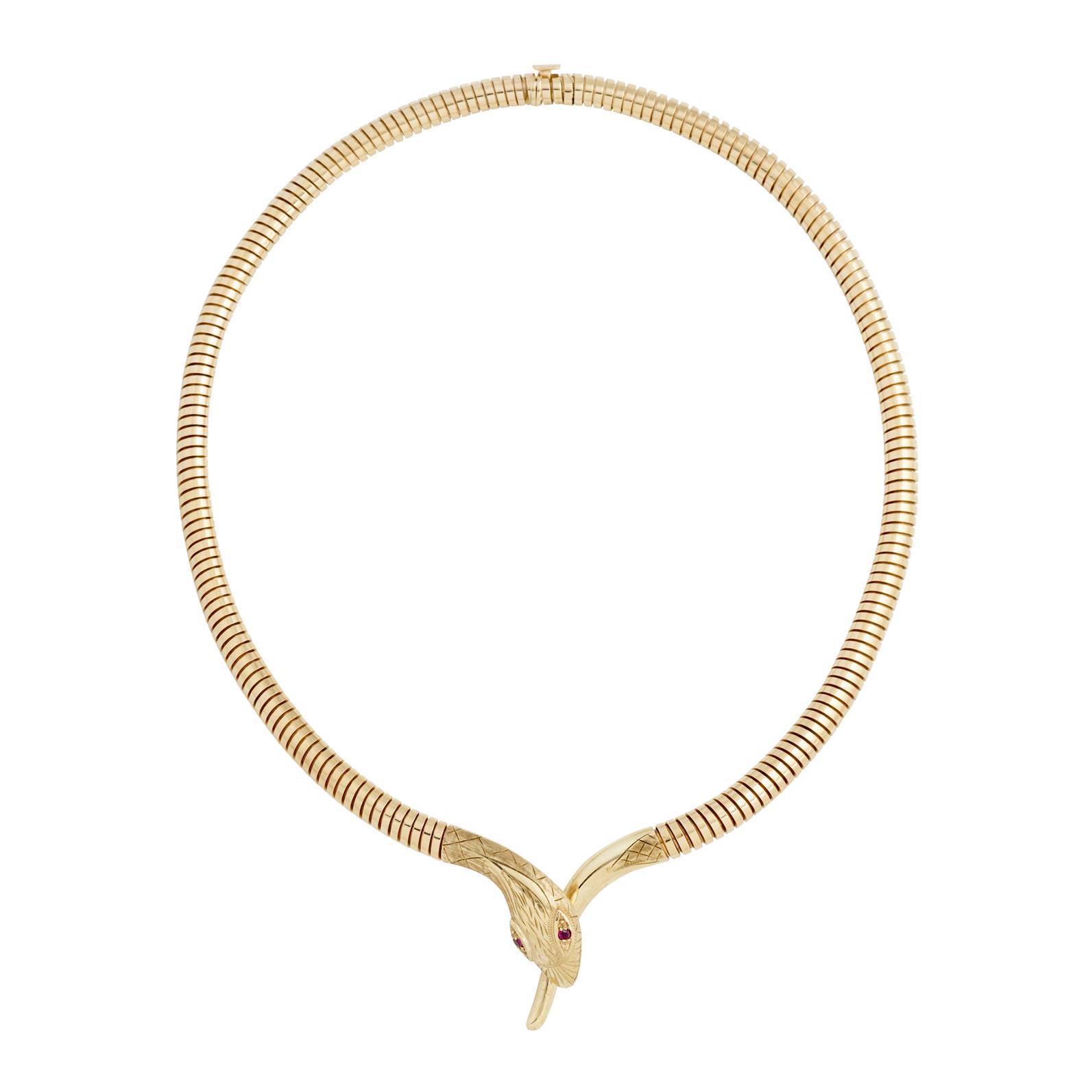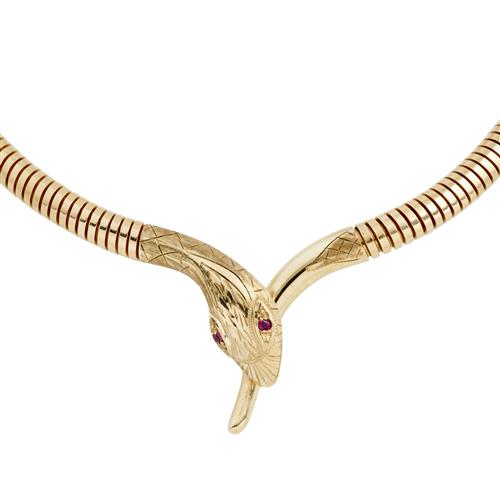 Modelled as a snake, the eyes gem-set to an ornate engraved head, the body composed of a tubogas style link with integrated tongue and groove clasp, gross weight approximately 37.2 grams, inner circumference approximately 380mm, Birmingham hallmarks.