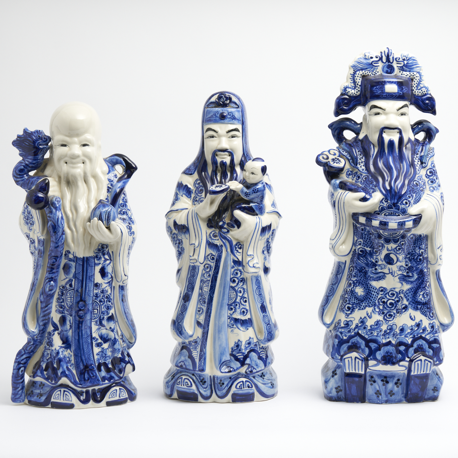A VIETNAMESE CHINESE BLUE AND WHITE PORCELAIN FU LU SHOU SET H.59CM (TALLEST)
