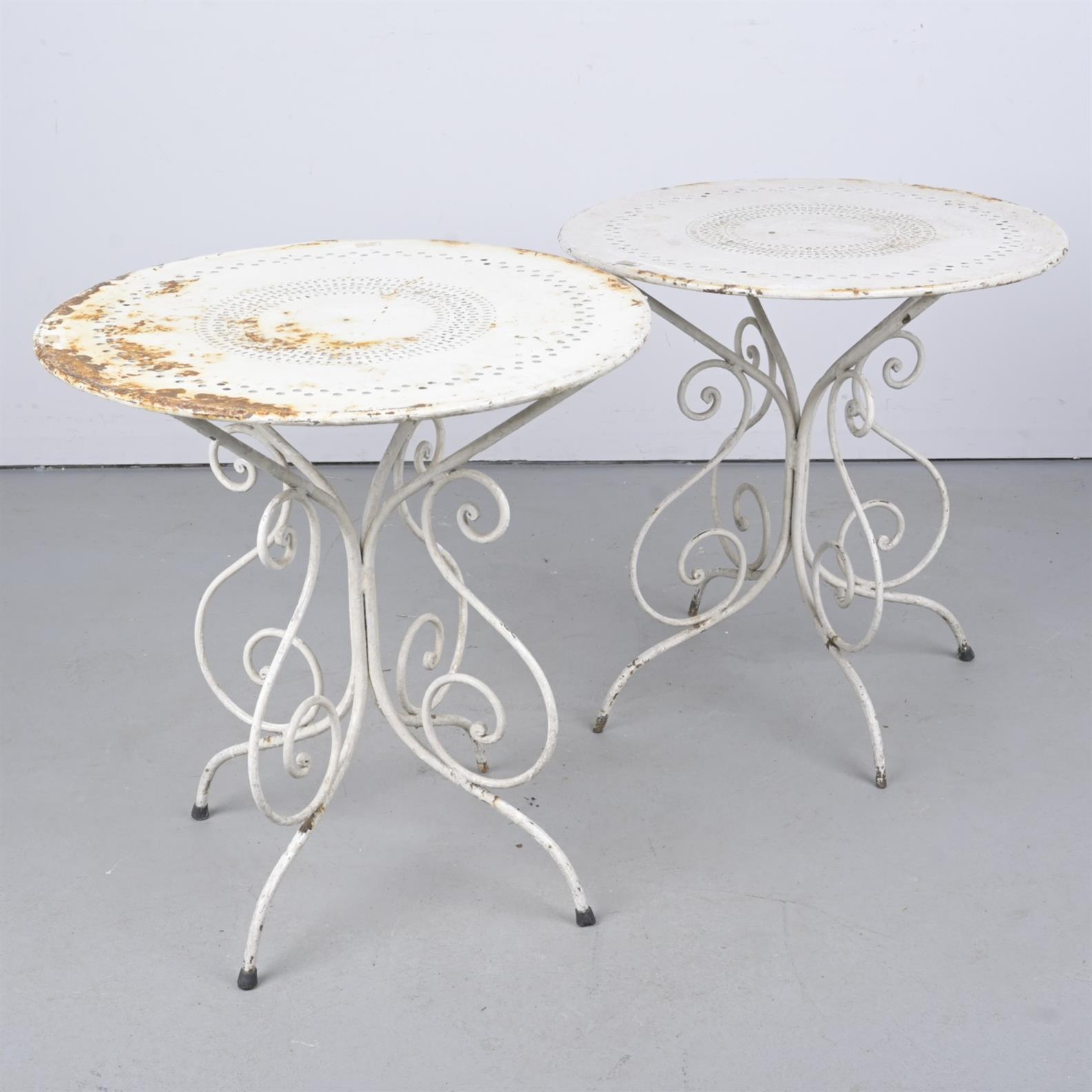 A PAIR OF FRENCH OUTDOOR TABLES (A/F) (73H X 69DIA CM)