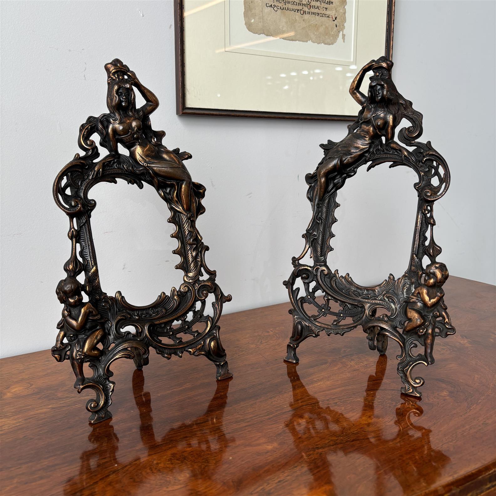 A PAIR OF REGISTERED BRONZED CAST IRON FIGURAL AND CHERUB FRAMES H.34.5CM