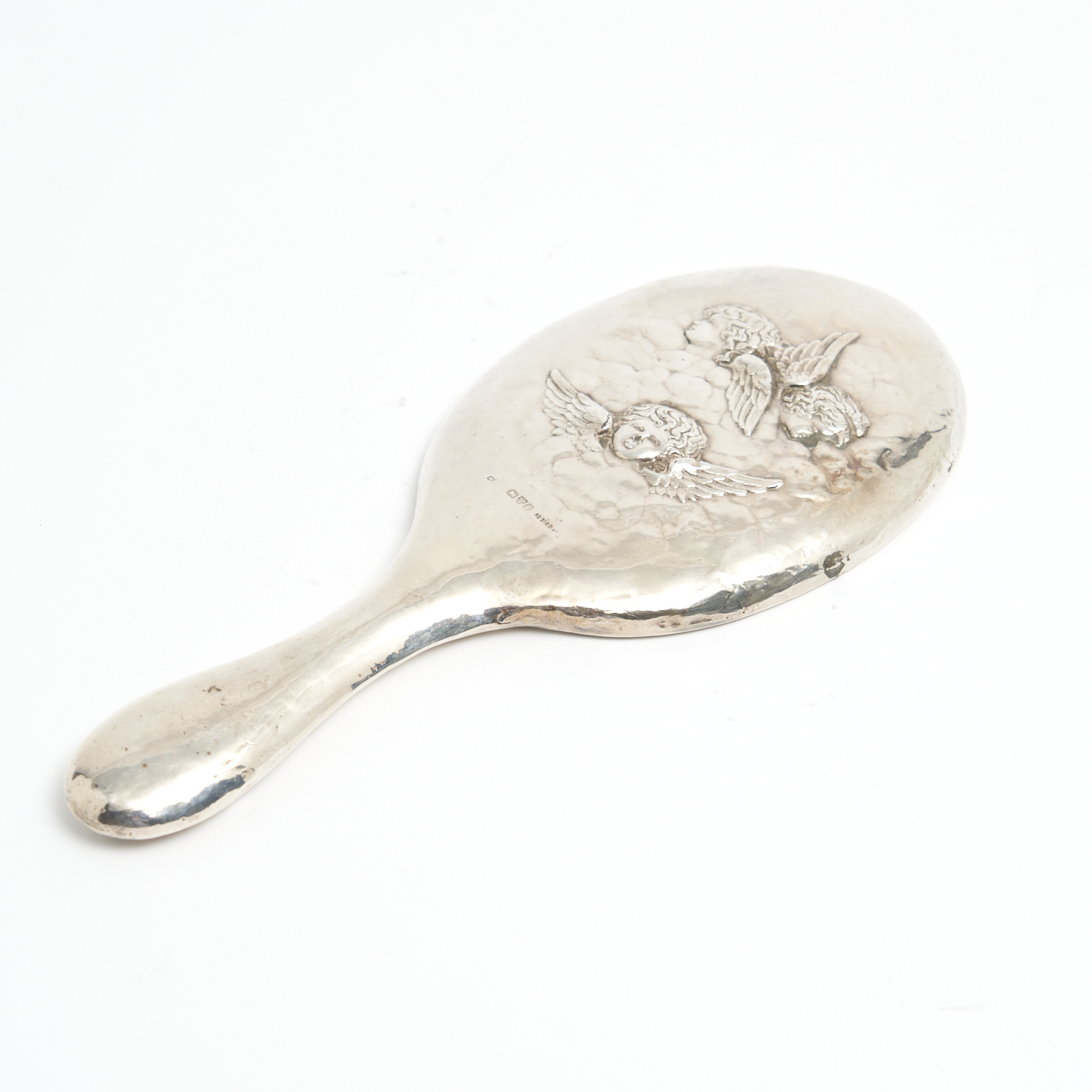 AN ENGLISH STERLING SILVER REYNOLDS ANGELS HAND MIRROR L.26.5CM