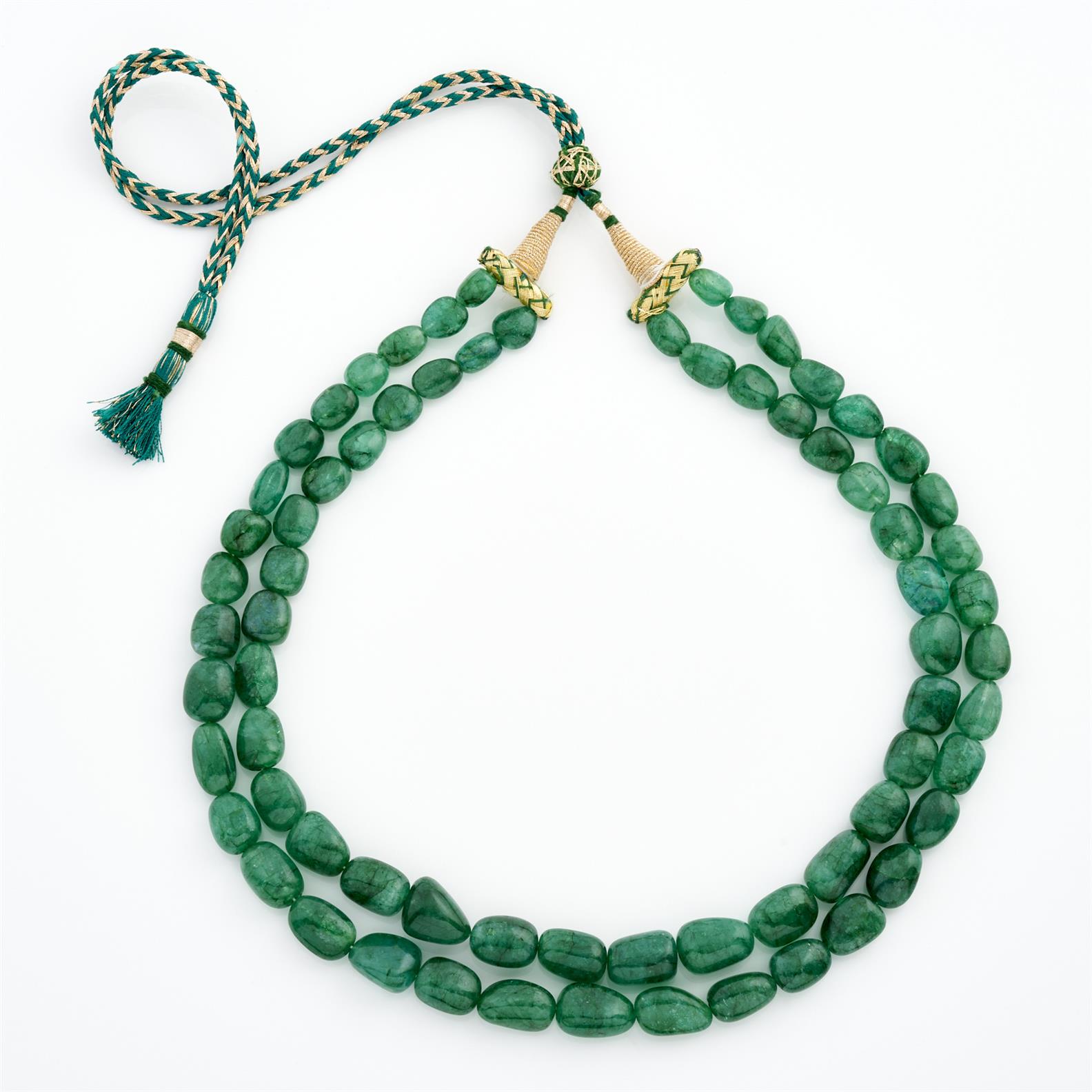 A DOUBLE STRAND OF TREATED EMERALD BEADS, TO A FABRIC CORD, 480MM ADJUSTABLE