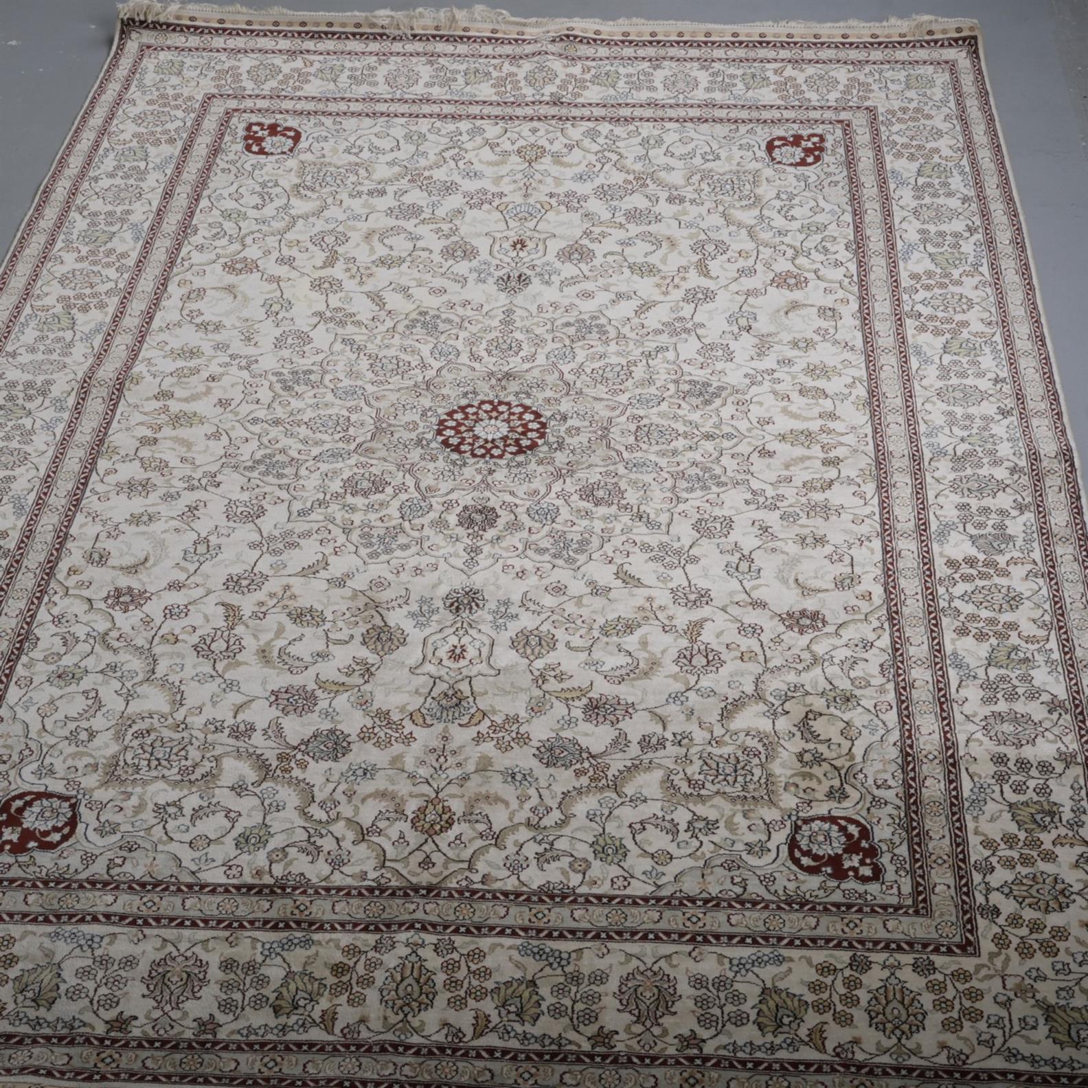 A PERSIAN QUM SHAHREZA SILK AND WOOL RUG. TRADITIONAL QUM DESIGN OF CENTRAL ANCHORED FLORAL MEDALLION AND QUARTERED CORNER MEDALLION...