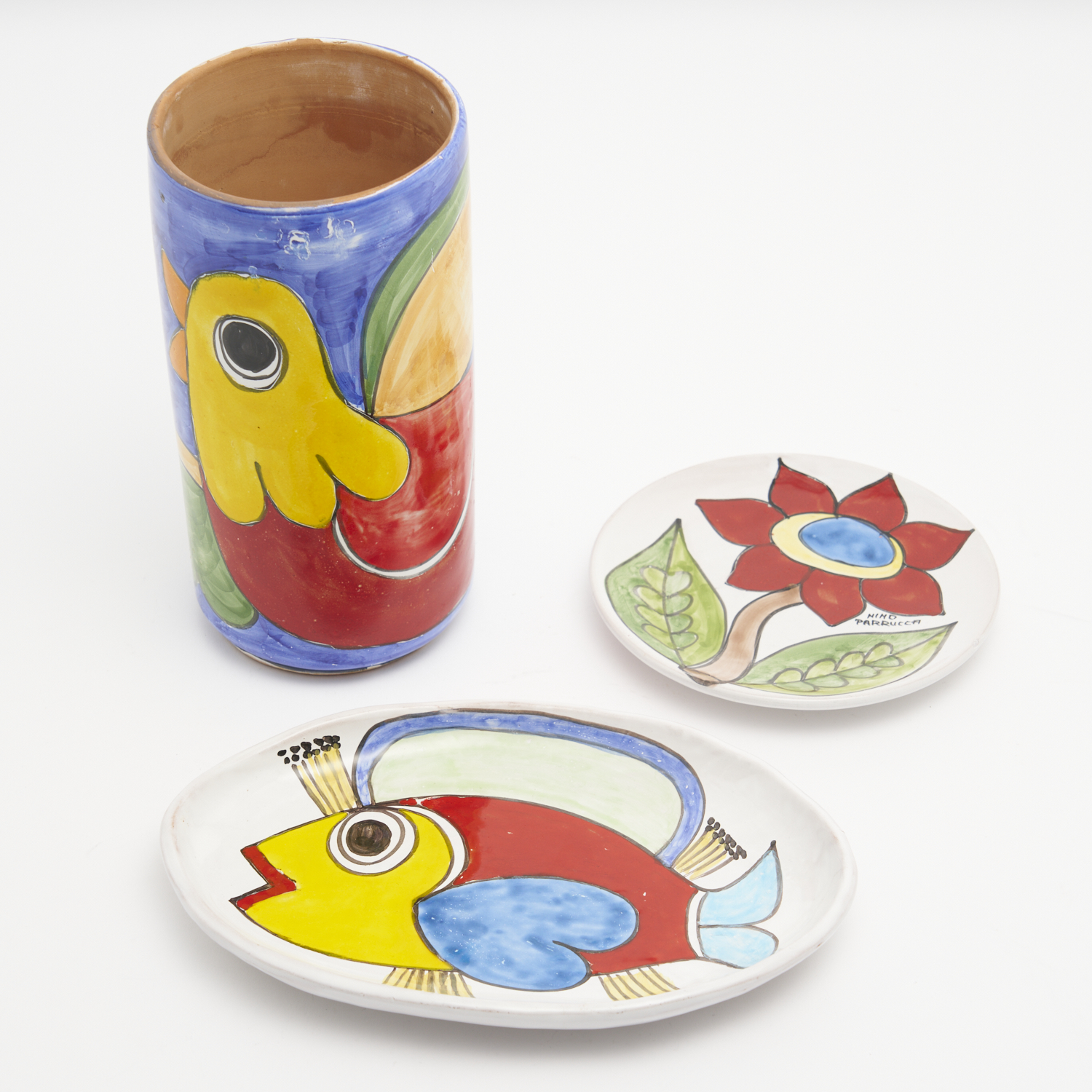 A TRIO OF NINO PARRUCCA CERAMIC ITEMS INCLUDING A LARGE VASE, MADE IN ITALY (SMALLER PLATE A/F) H.23.5CM (TALLEST)