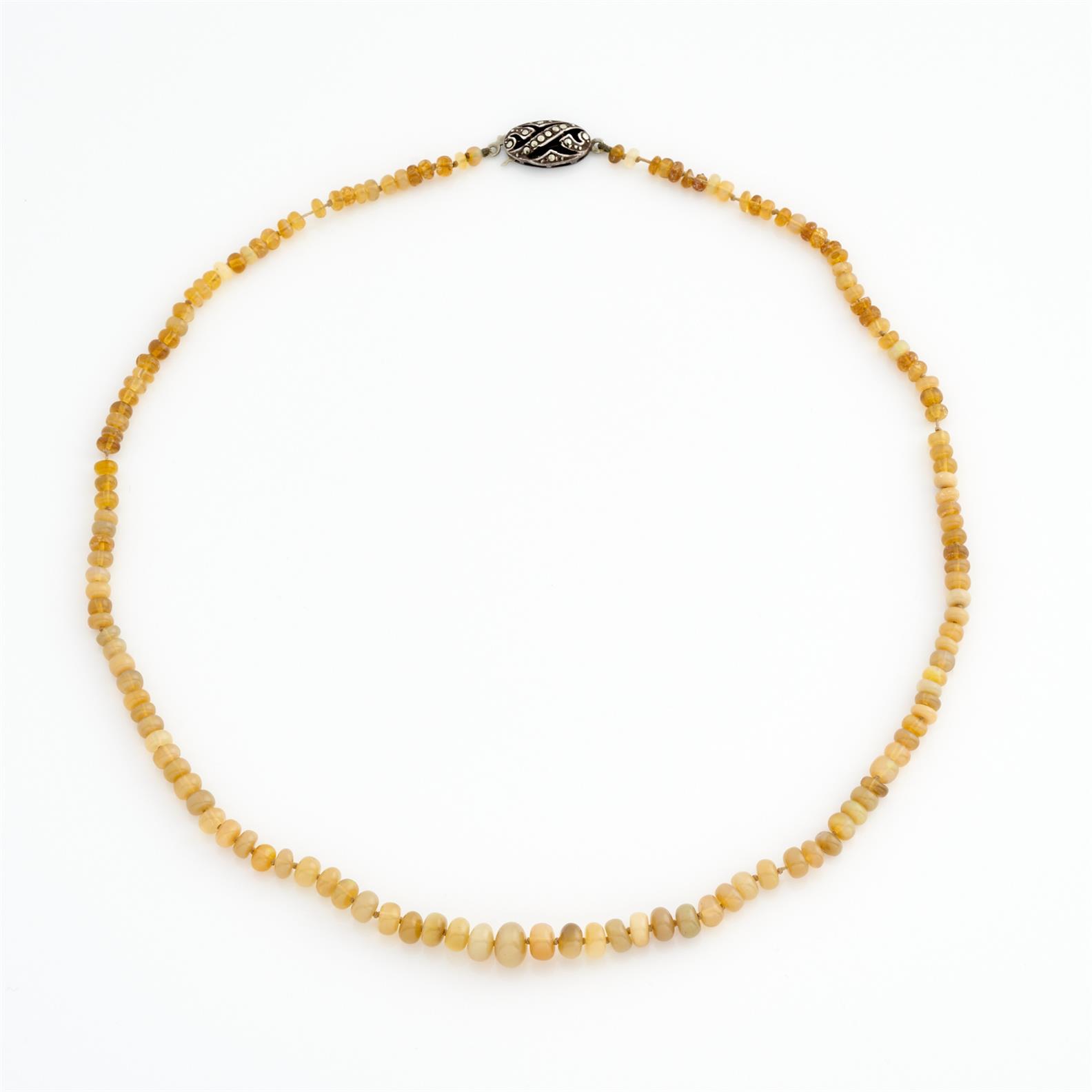 A STRAND OF OPAL BEADS TO A MARCASITE CLASP IN STERLING SILVER, 420MM