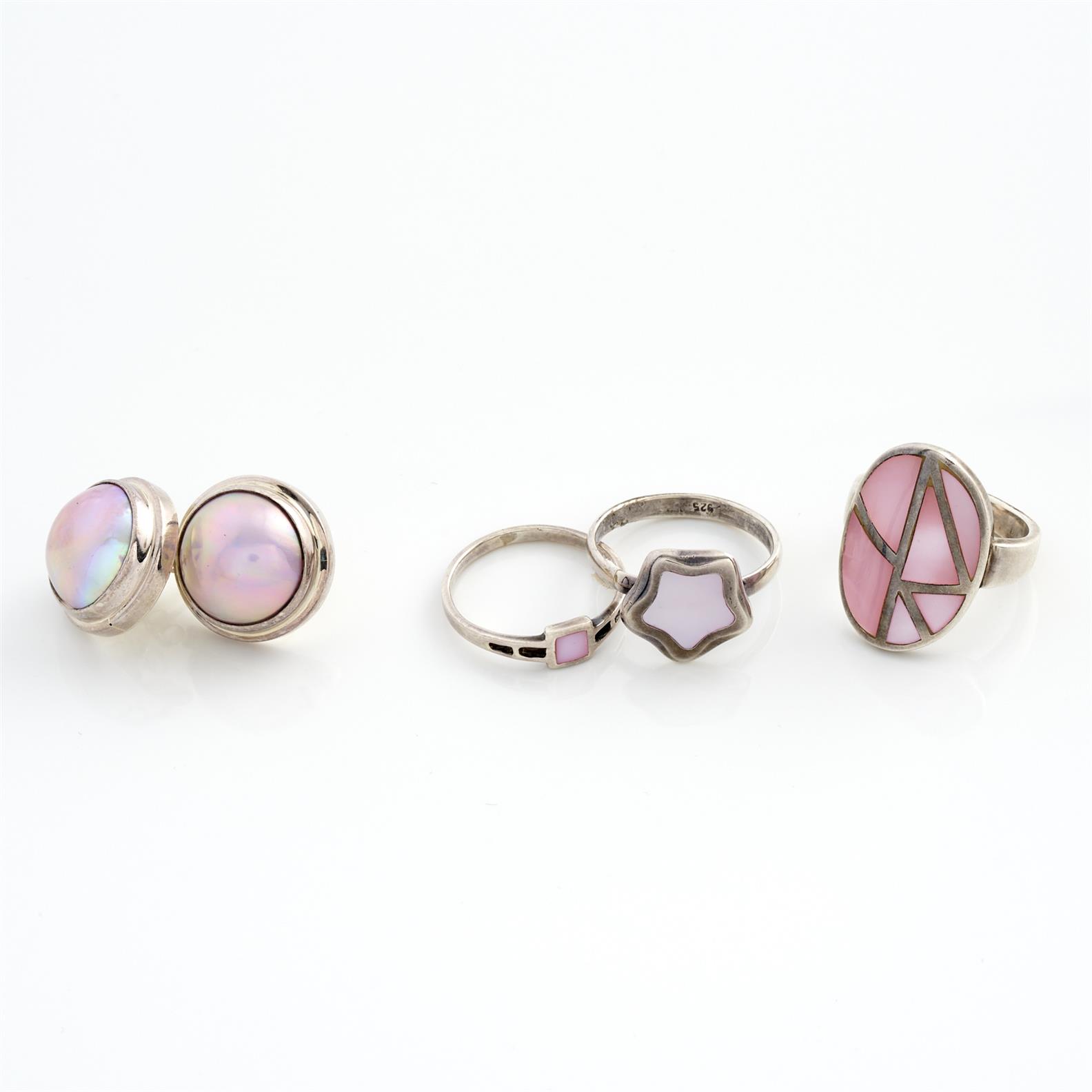 A PAIR OF MABE PEARL EARRINGS TO POST AND BUTTERFLY FITTINGS, TOGETHER WITH THREE RINGS, ALL IN STERLING SILVER, SIZE P,R1/2, P