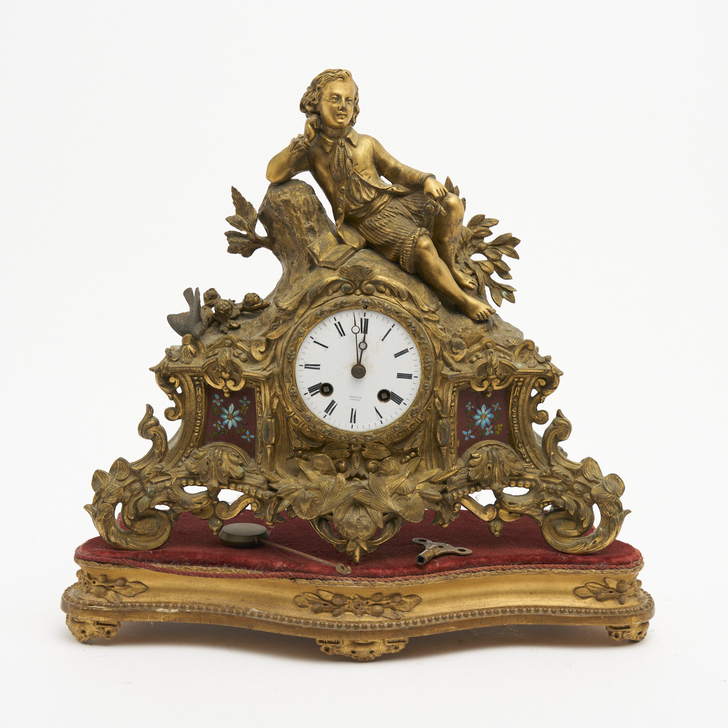 A FRENCH LATE 19TH CENTURY FIGURAL GILT BRONZE CLOCK ON MATCHING PEDESTAL, WITH KEY AND PENDULUM H.37CM (TOTAL HEIGHT)