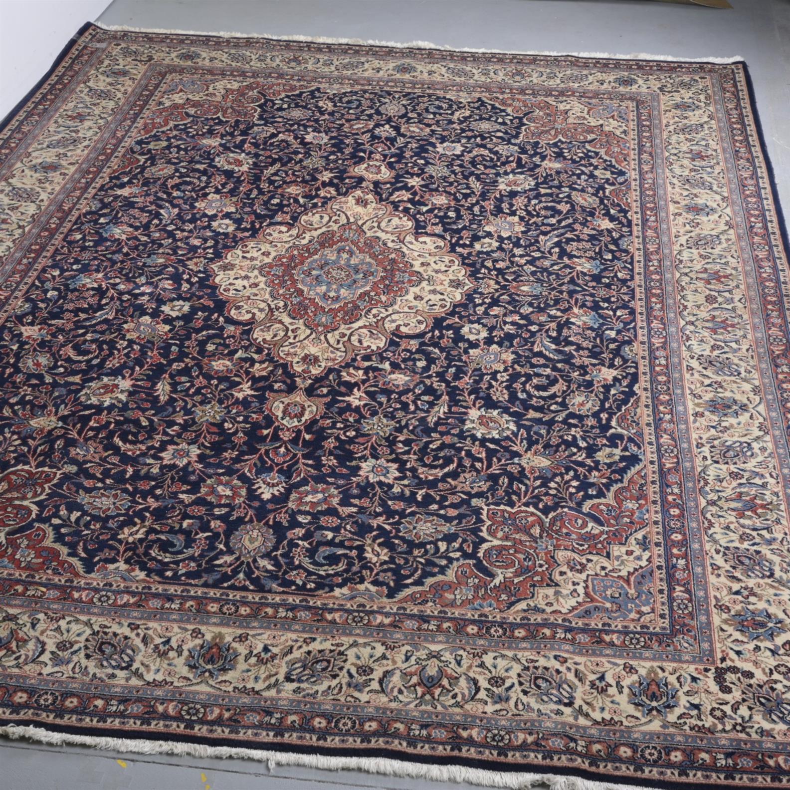 A PERSIAN HANDMADE WOOL RUG WITH DARK NAVY GROUND AND CREAM MEDALLION / BORDERS. ORIGIN: IRAN (374 X 267 CM) (PLEASE NOTE THERE MAY BE SOME COLOUR VARIATION FROM PHOTOGRAPH)