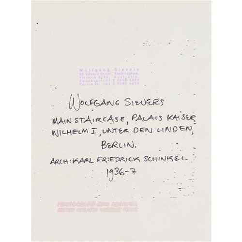 signed, dated and inscribed verso: WOLFGANG SIEVERS/ MAIN STAIRCASE, PALAIS KAISER/ WILHELM I, UNTER DEN LINDEN,/ BERLIN./ ARCH: KARL FRIEDRICH SCHINKEL/ 1936-7