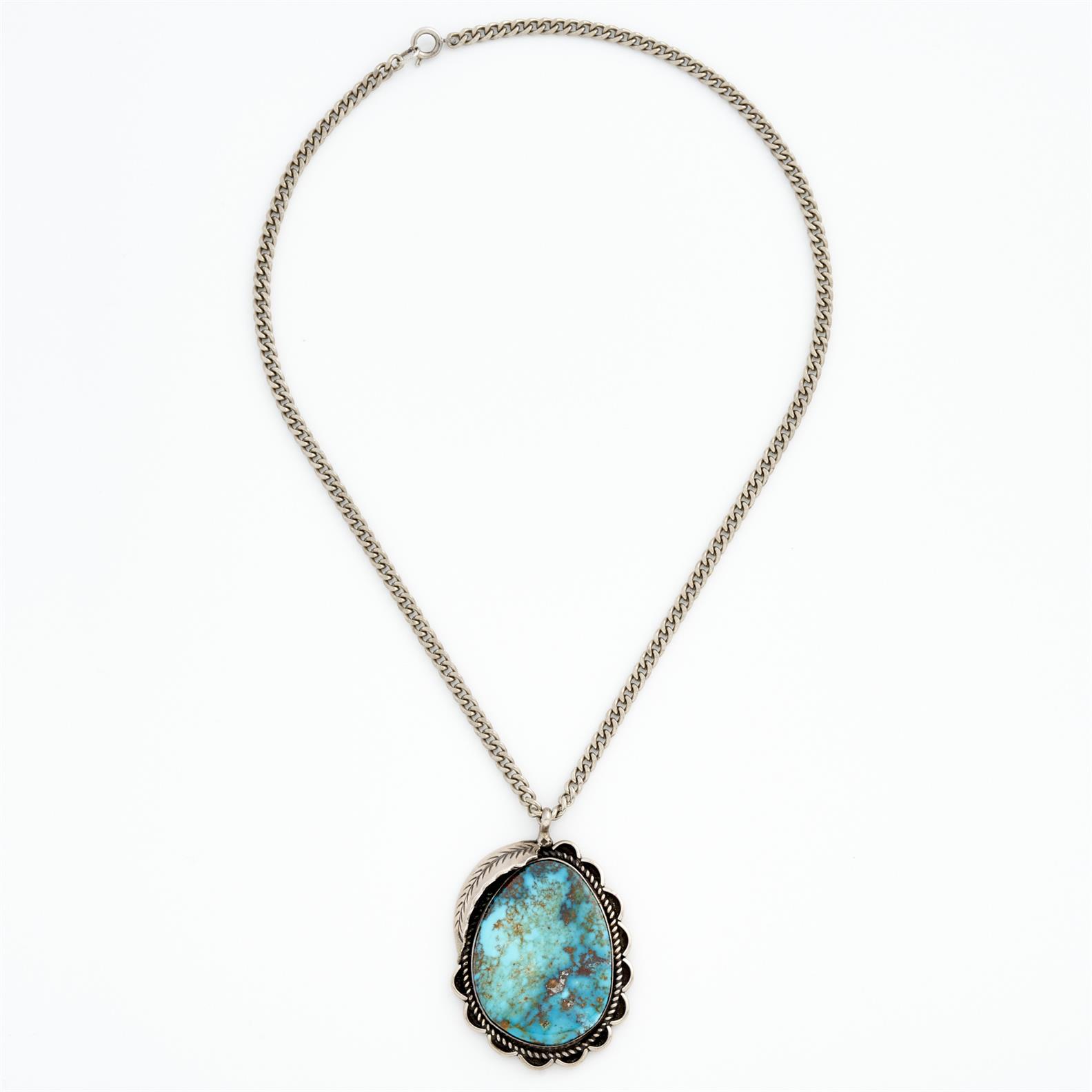 A LARGE HARDSTONE PENDANT NECKLACE IN BASE METAL, THE PENDANT MEASURING 57 X 40MM, 480MM