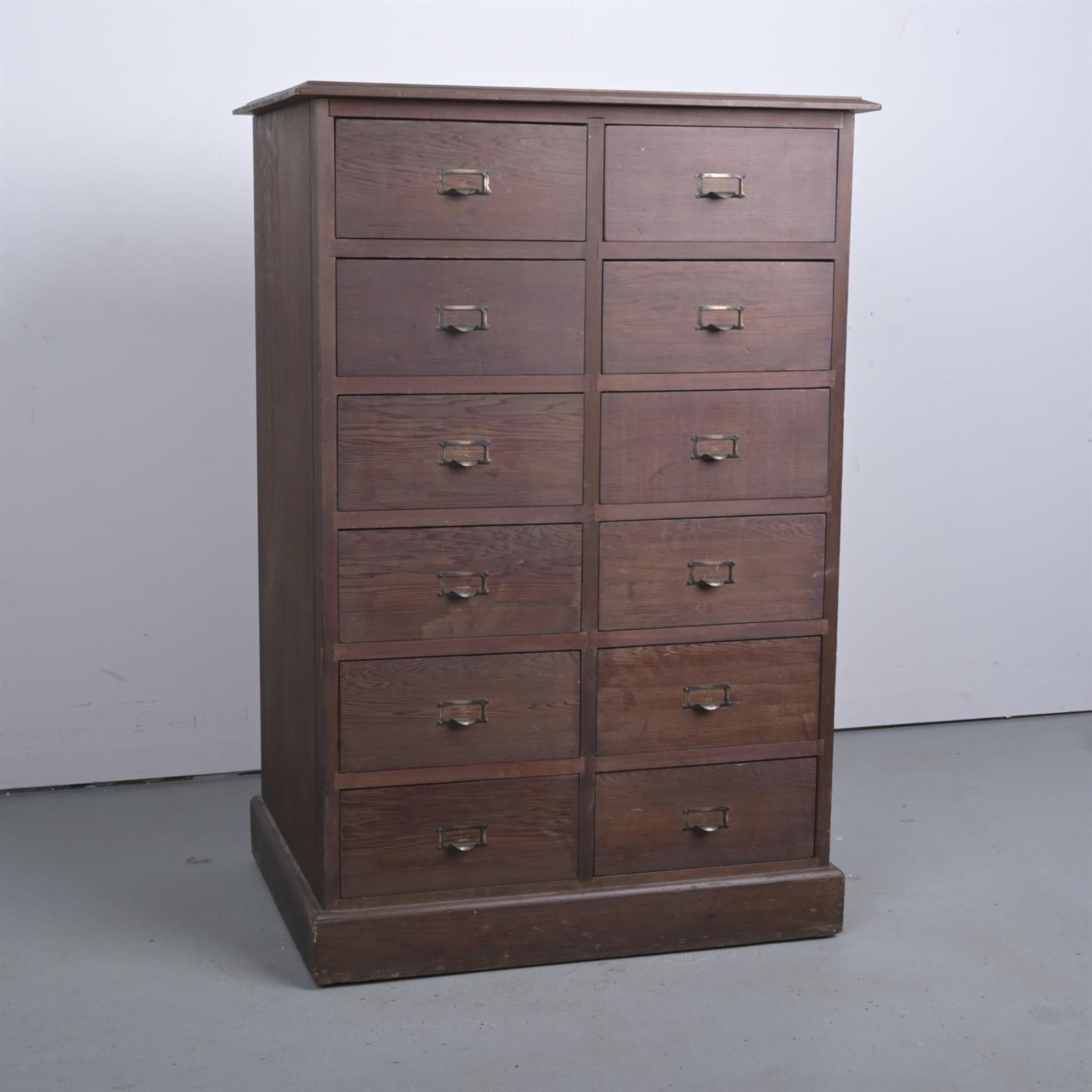 A TWELVE DRAWER OFFICE FILING CABINET ON A PLINTH BASE, CIRCA 1910 (A/F) (118H X 79W X 57D CM) (THIS ITEM MUST BE REMOVED BY CARRIERS AT THE CUSTOMER'S EXPENSE. LEONARD JOEL STAFF CANNOT ASSIST CARRYING THIS ITEM.)