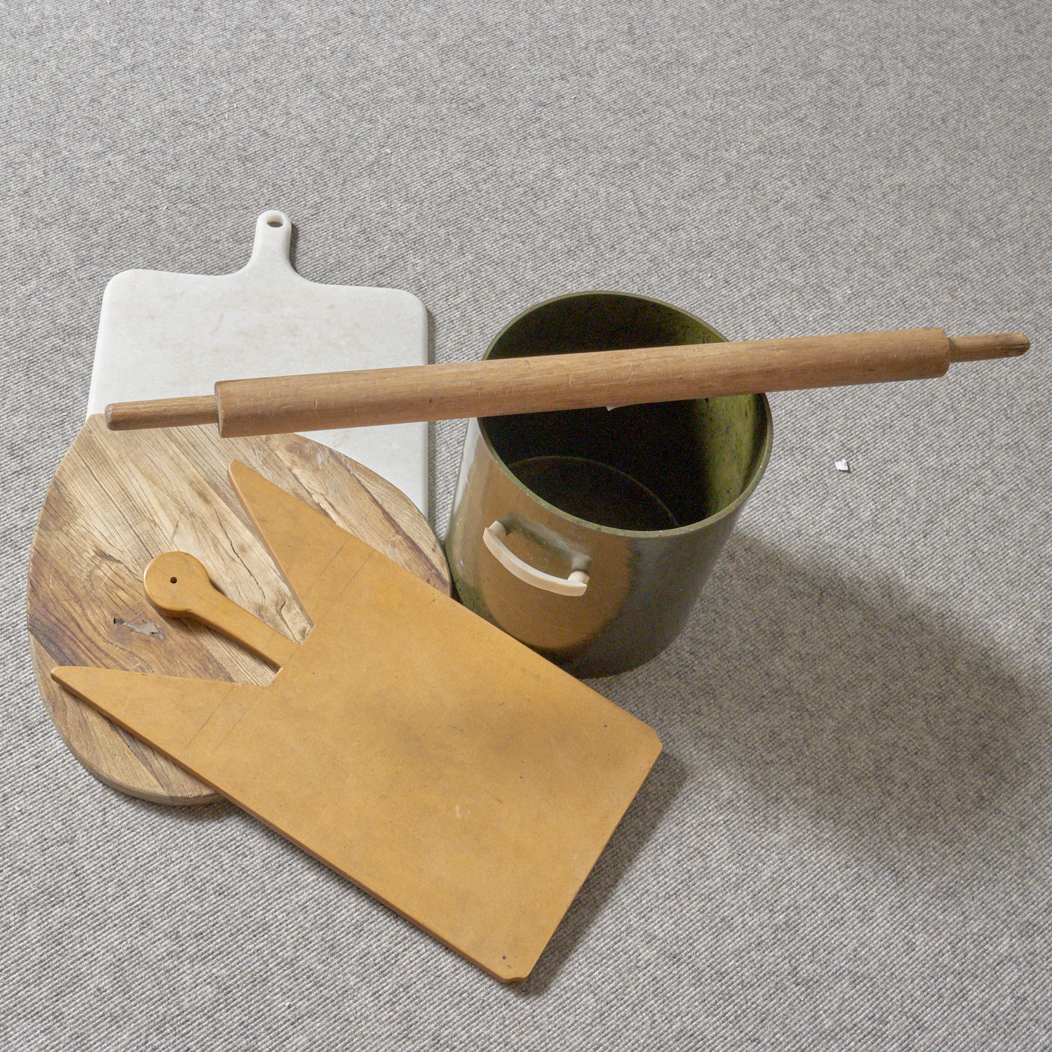 A COLLECTION OF VINTAGE KITCHENALIA INCLUDING THREE CHOPPING BOARDS, AN OVERSIZED ROLLING PIN, AND A HAXBY WARE BAKELITE POT H.27CM (TALLEST)