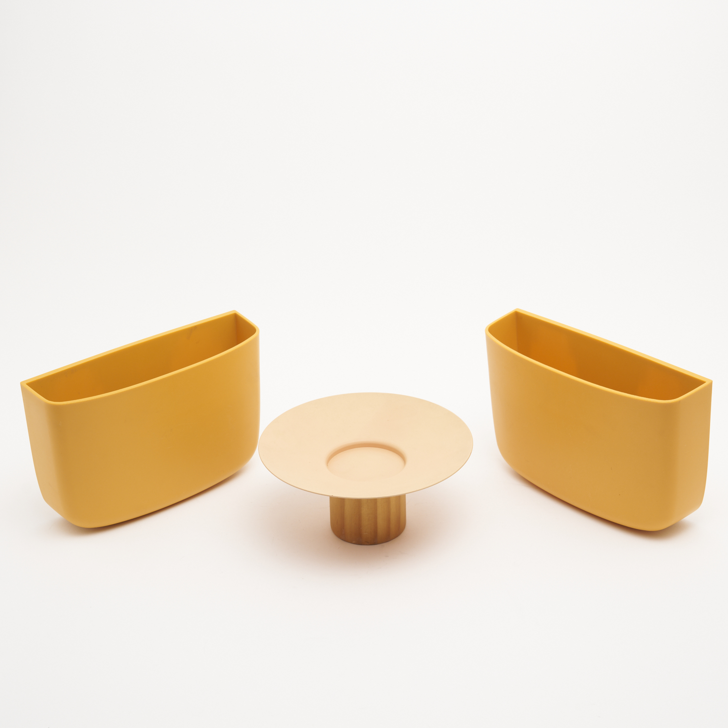 A GROUP OF POST MODERN ITEMS INCLUDING A PAIR OF NORMANN COPENHAGEN POCKET ORGANIZERS BY SIMON LEGALD WITH A GOOD THING TRINKET DISH BY JAMIE WOLFOND W.28CM (LARGEST)