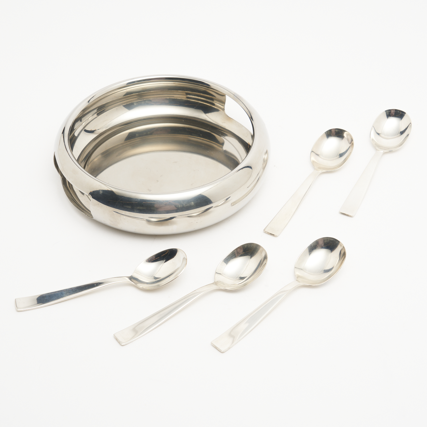 A SET OF FIVE SILVER PLATED GIO PONTI SPOONS TOGETHER WITH A 'SPHERA' BOWL FOR SAMBONET, MADE IN ITALY DIA.23.5CM (BOWL)