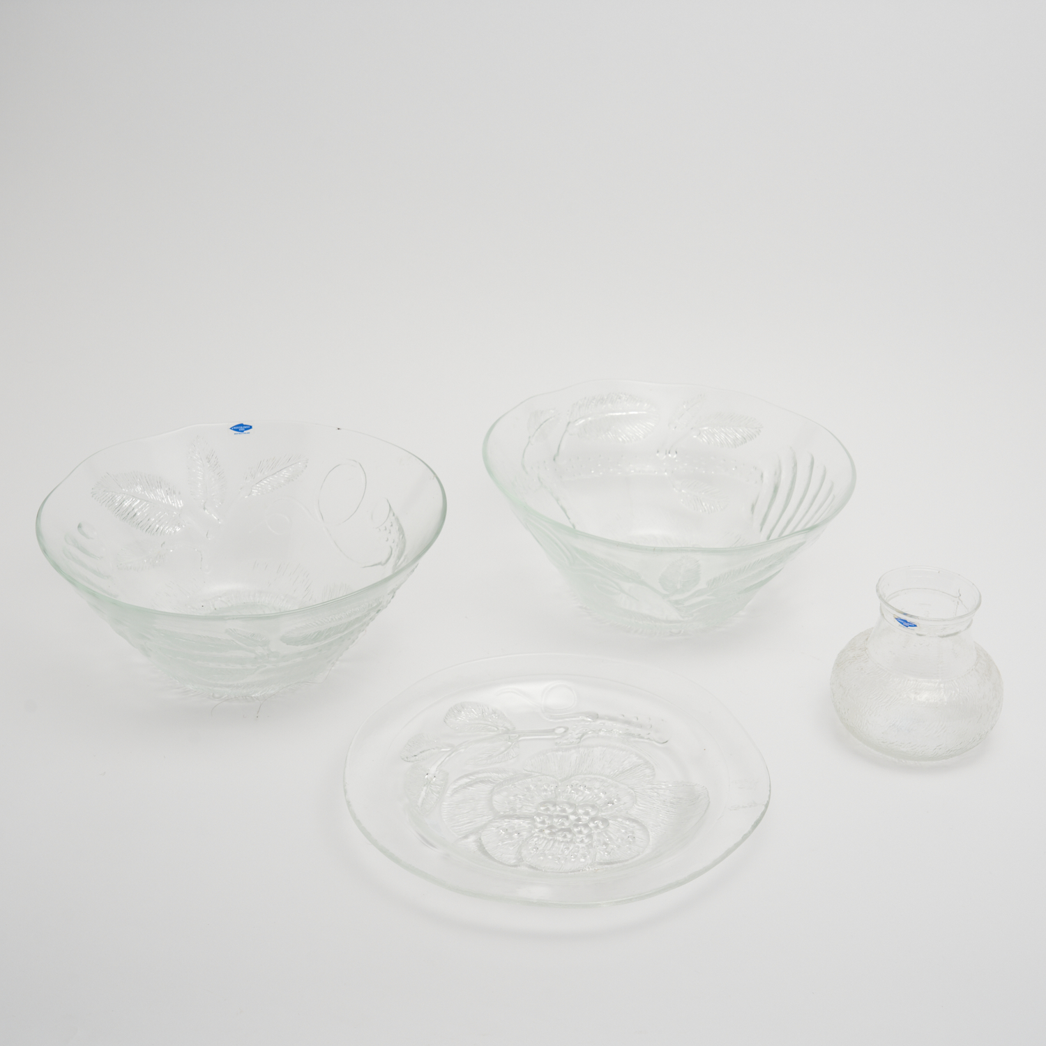 A NUUTAJÄRVI LOT, INCLUDING TWO LARGE BOWLS, PLATE AND VASE BY OIVA TOIKKA, MADE IN FINLAND DIA.27CM (LARGEST BOWL)