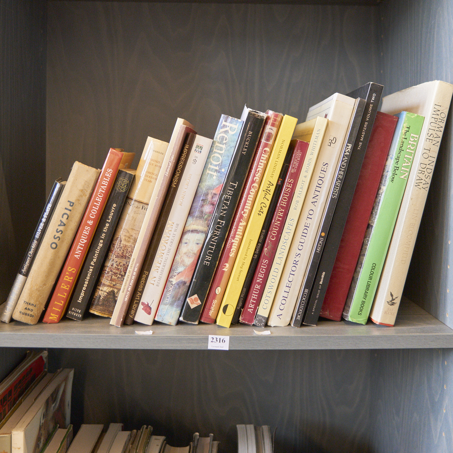 A SHELF OF ART AND DESIGN REFERENCE INCLUDING TIBETAN FURNITURE, NORMAN LINDSAY IMPULSE TO DRAW, ARTFUL CATS, LA SCALA, AND CHINESE COUNTRY ANTIQUES