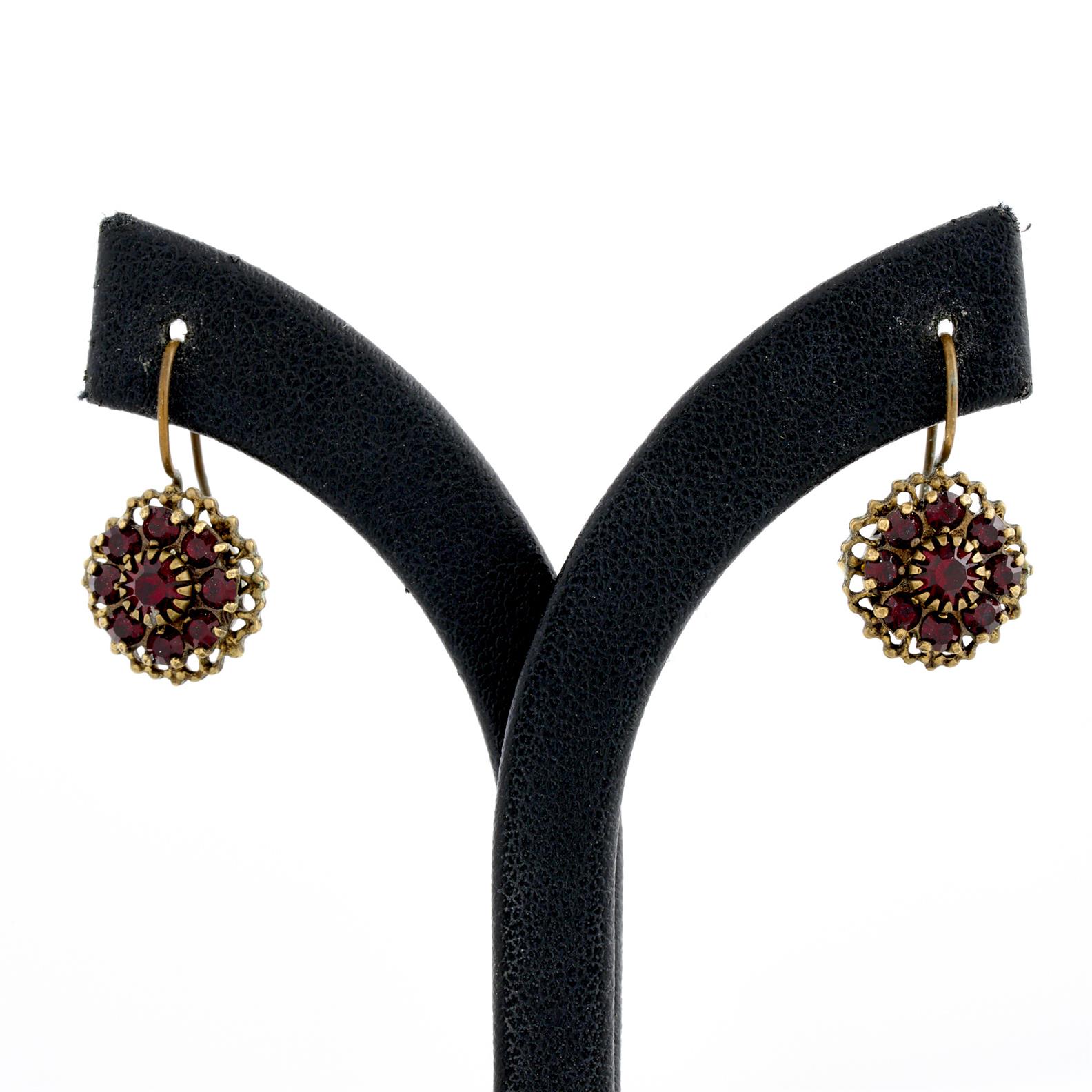 A PAIR OF GARNET CLUSTER EARRINGS IN BASE METAL, TO SHEPHERD HOOK FITTINGS, DIAMETER 11MM
