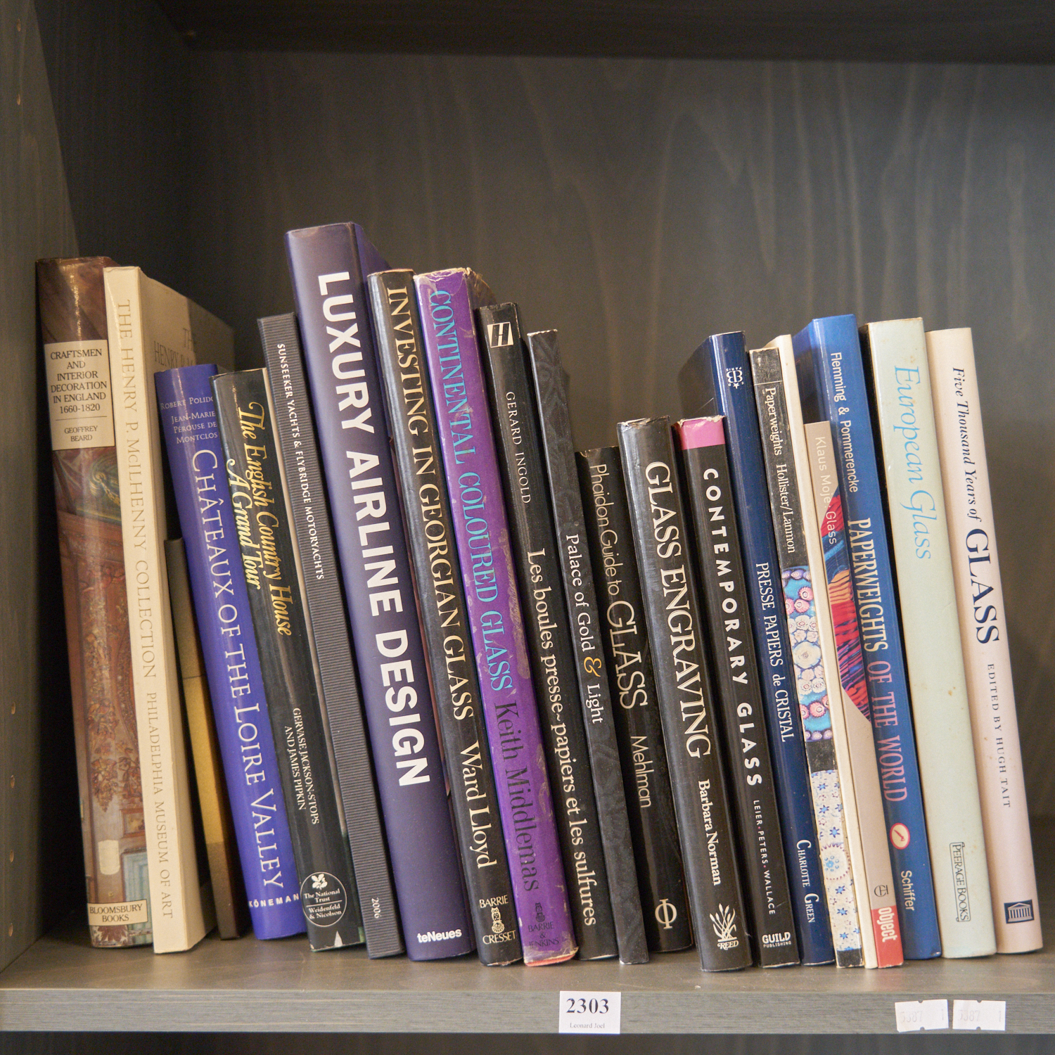 A SHELF OF REFERENCE BOOKS CONCERNING COLLECTING GLASS AND INTERIOR DESIGN