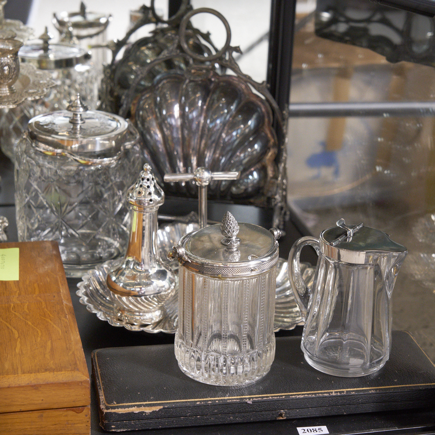 A COLLECTION OF SILVER PLATE AND CRYSTAL TABLE WARE INCLUDING A BISCUIT SACHET, A BISCUIT BARREL, MILK AND SUGAR AND SHELL FORM STAND, AND SUGAR SIFTER H.27CM (TALLEST)