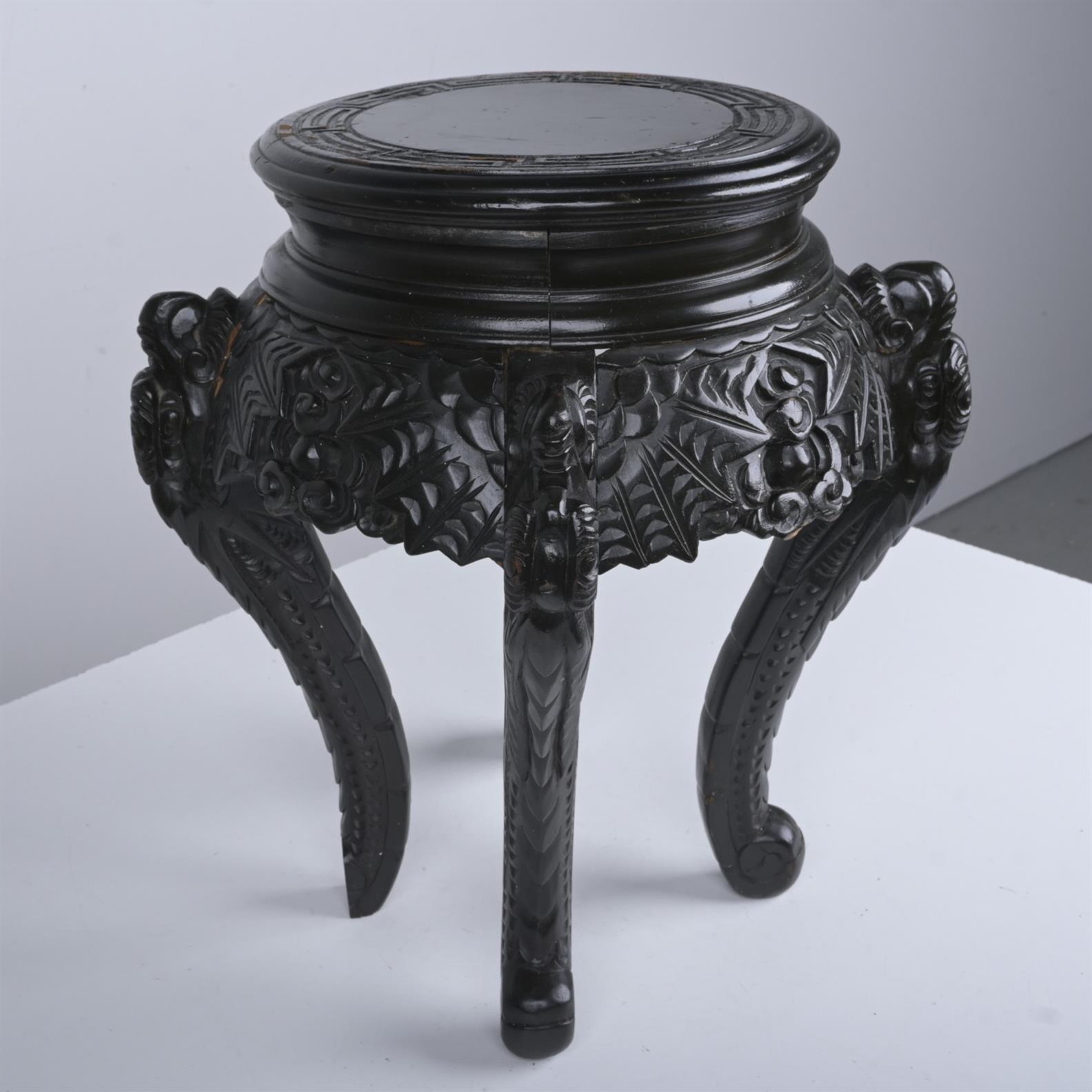 AN EBONISED CARVED WOODEN CIRCULAR PEDESTAL (49H X 36DIA CM)