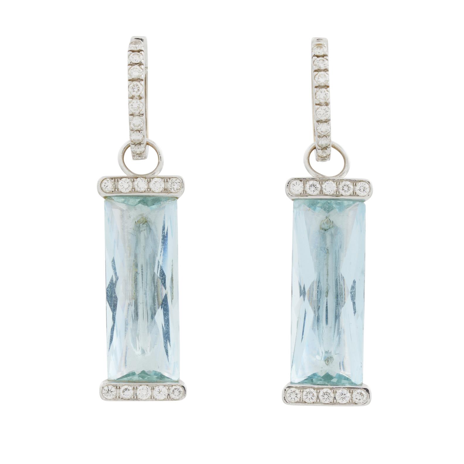 Comprised of a micro claw-set diamond huggie earring from which is suspended a pair of pendant drops consisting of tension set rectangular scissor cut elongated natural aquamarine gemstones flanked at either end by a grain set diamond bar, length approximately 40mm, gross weight approximately 10.0 grams.