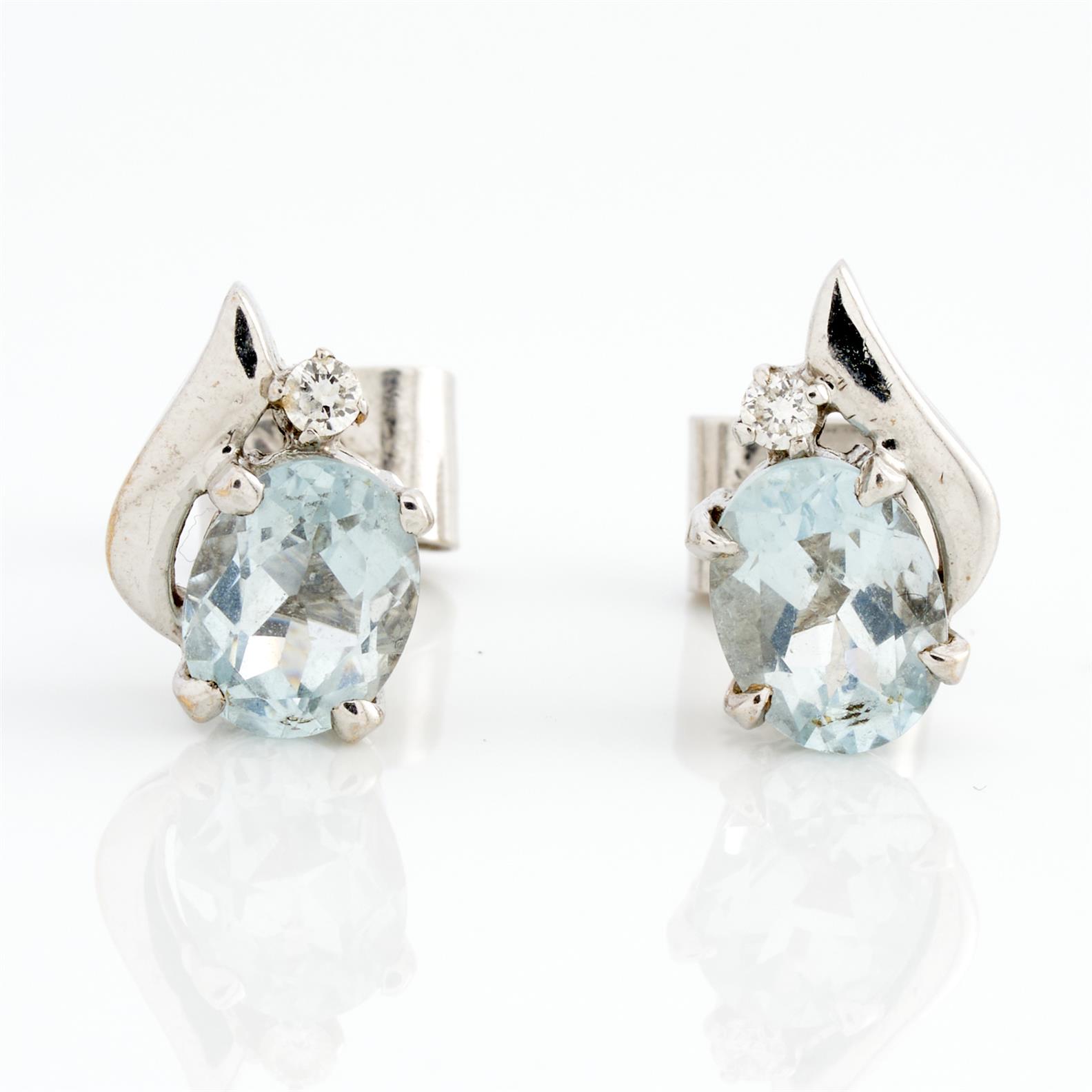 A PAIR OF AQUAMARINE AND DIAMOND EARRINGS IN 18CT WHITE GOLD, TO POST AND BUTTERFLY FITTINGS, LENGTH 12MM, 4.1GMS