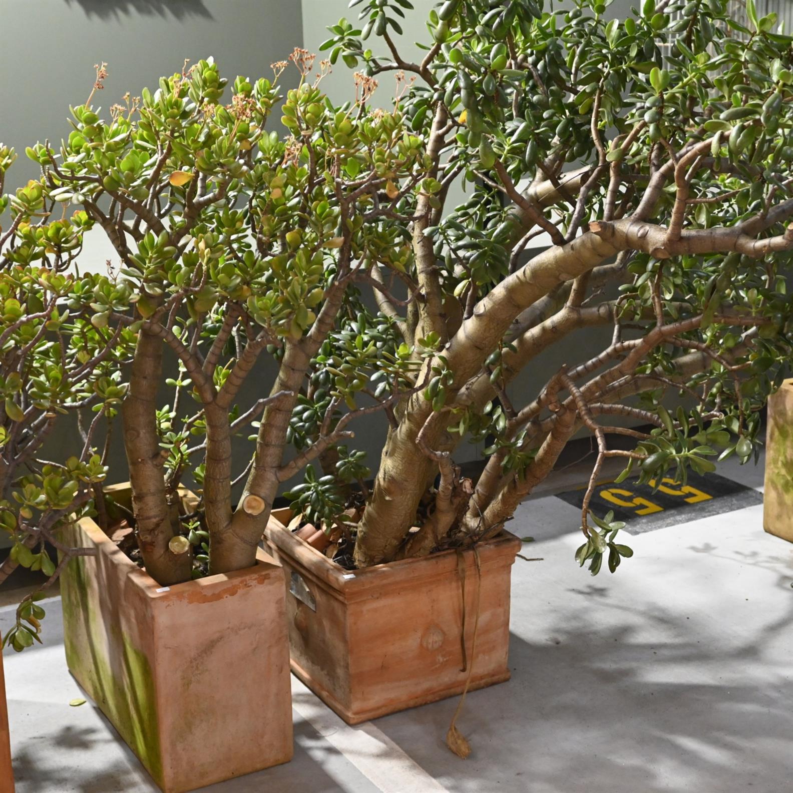 TWO JADE PLANTS, ONE IN RECTANGULAR PLANTER AND ANOTHER IN SQUARE PLANTER (THIS ITEM MUST BE REMOVED BY CARRIERS AT THE CUSTOMER'S EXPENSE. LEONARD JOEL STAFF CANNOT ASSIST CARRYING THIS ITEM.)