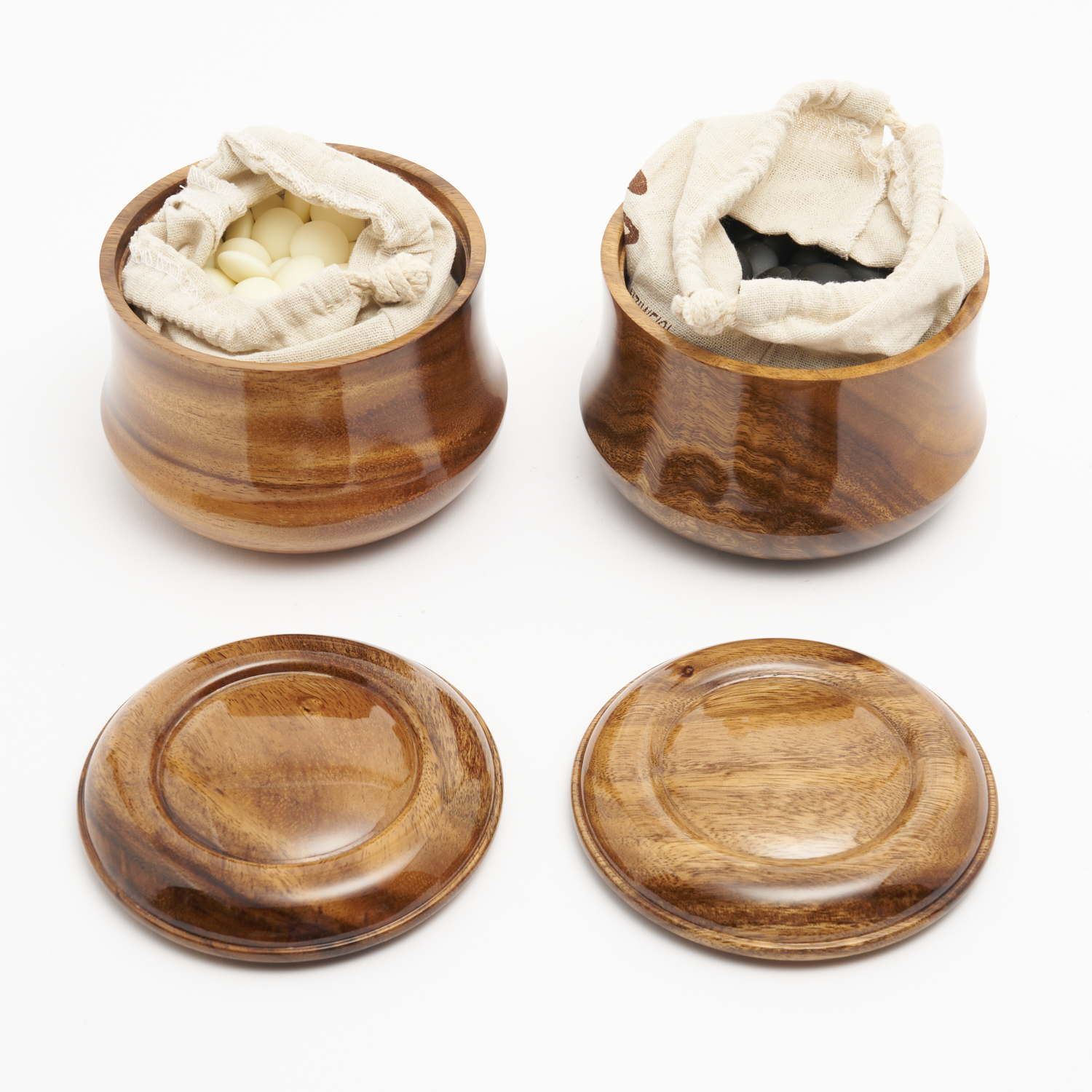 A SET OF CHINESE YUNZI GO CHESS PIECES (SIZE APPROX 34), IN WOODEN CONTAINERS, W.14CM
