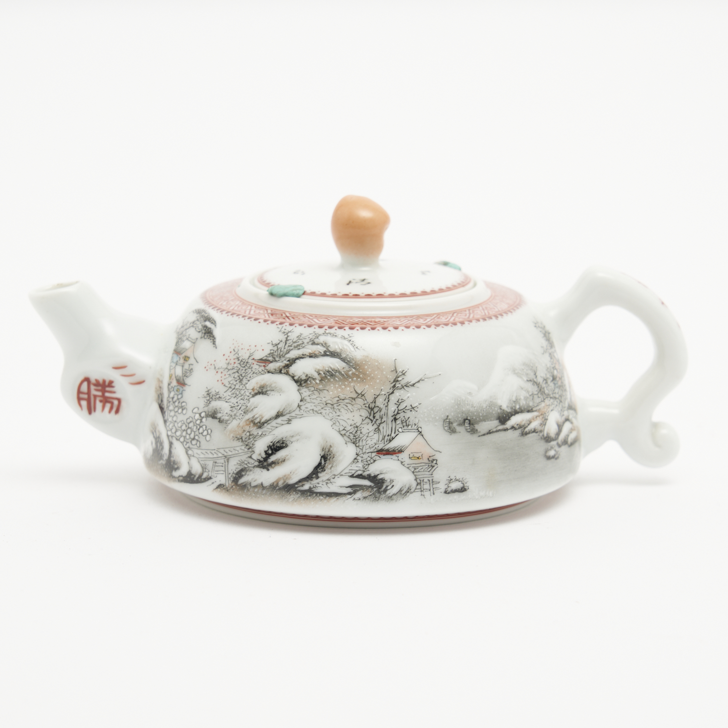 A CHINESE PORCELAIN TEAPOT PAINTED WITH A SNOW SCENE, MARK TO BASE W.16.5CM