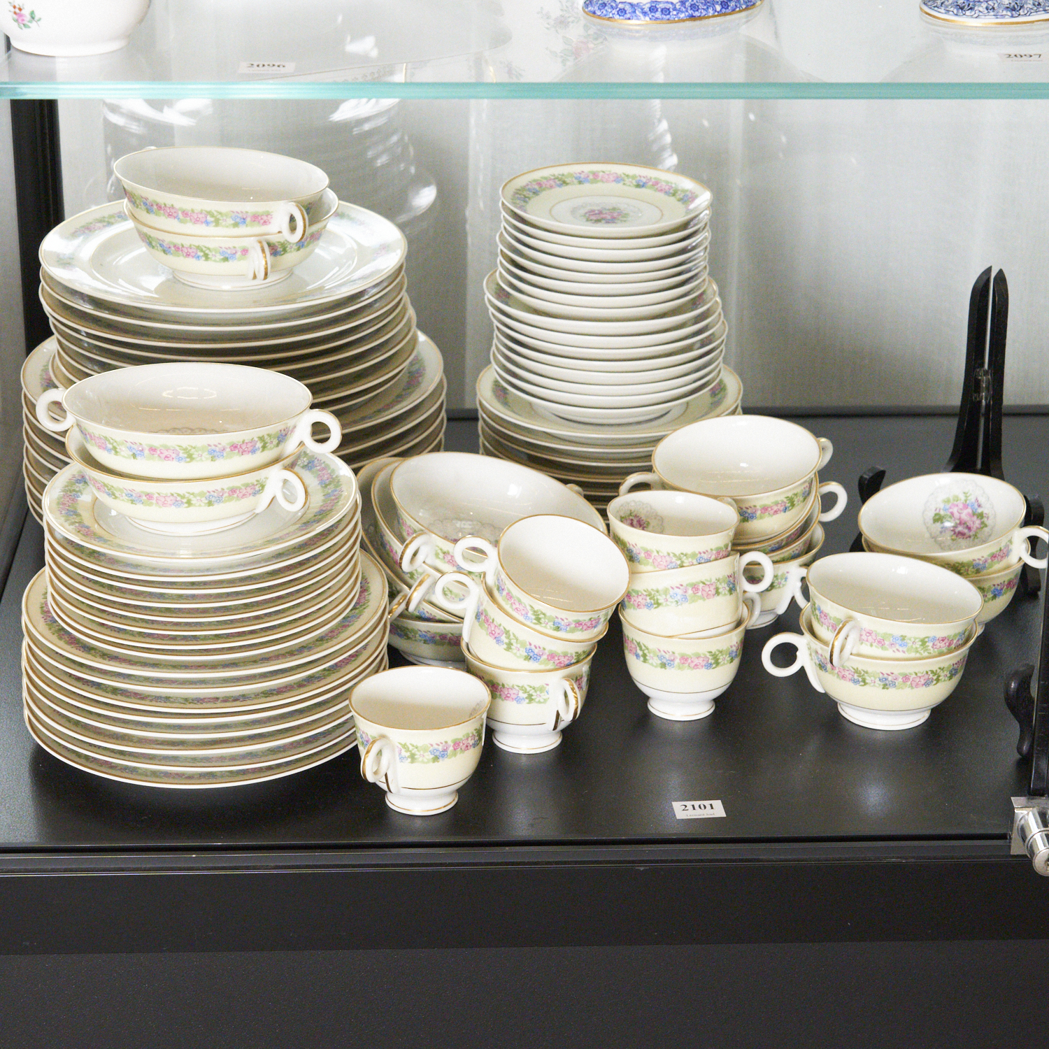 A THEODORE HAVILAND FOR LIMOGES PART DINNER SET FOR EIGHT PLUS (MISSING COFFEE CUP) DIA.25CM (LARGEST)