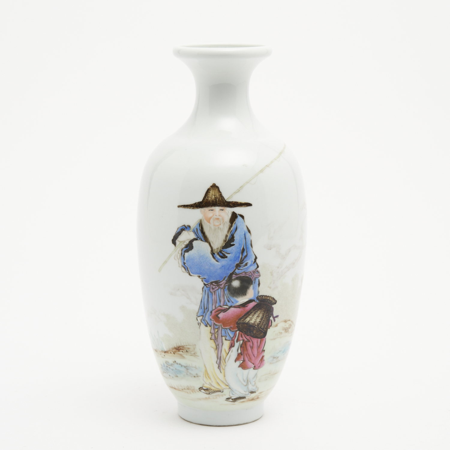 A CHINESE REPUBLIC PERIOD VASE BY WANG QI (1884-1937), PAINTED WITH A FISHERMAN AND A POEM ON THE REVERSE, THE REVERSE WITH INSCRIPTION IN BLACK BEARING THE SIGNATURE OF WANG QI WITH TWO IRON-RED SEALS. THE BASE WITH A SEAL OF WANG QI H.26.5CM