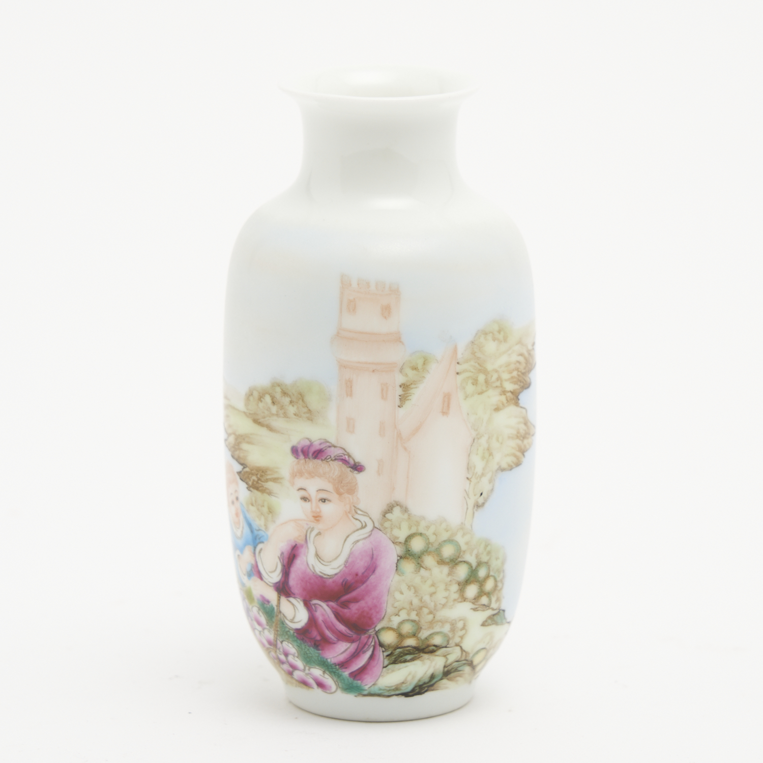 A CHINESE PORCELAIN VASE PAINTED WITH A CHILD AND A LADY HOLDING A FRUIT BASKET, FOUR CHARACTER MARK TO BASE H.12.CM