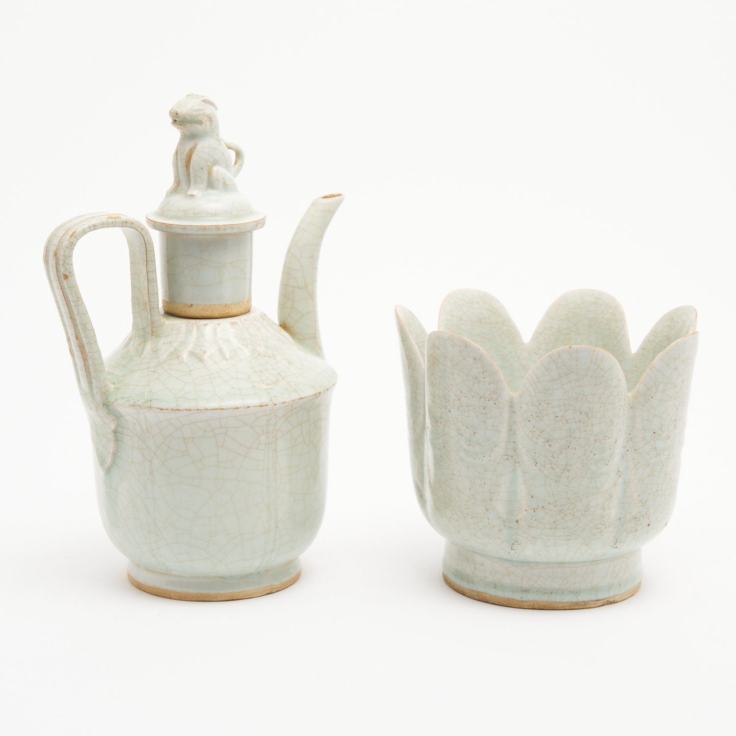 A QINGBAI GLOBULAR EWER WITH A LION-FINIAL COVER AND DEEP WARMING BOWL. RAISED ON A SHORT, TAPERED FOOT, A CURVED SPOUT AND A STRAP HANDLE H.30CM
