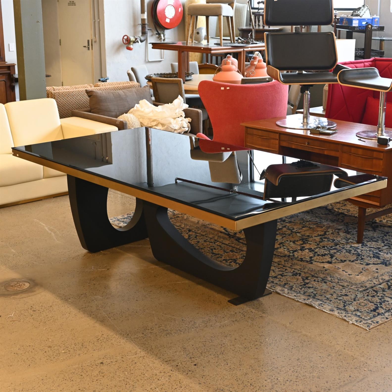A CONTEMPORARY SMOKED GLASS DINING TABLE (A/F) (75H X 242W X 120D CM) (THIS ITEM HAS TO BE REMOVED BY CARRIERS AT THE CUSTOMER'S EXPENSE. LEONARD JOEL STAFF WILL NOT ASSIST CARRYING THIS ITEM)