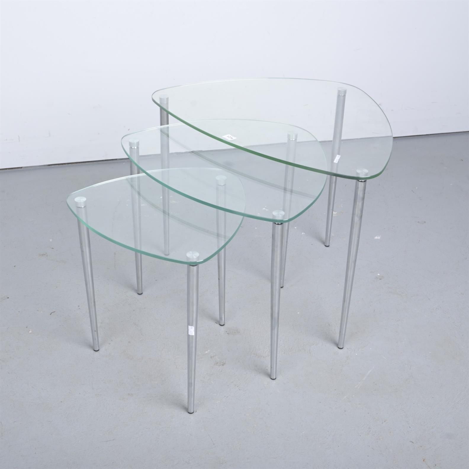 A NEST OF THREE GLASS AND CHROME SIDE TABLES (A/F) (46H X 65W X 46D CM)