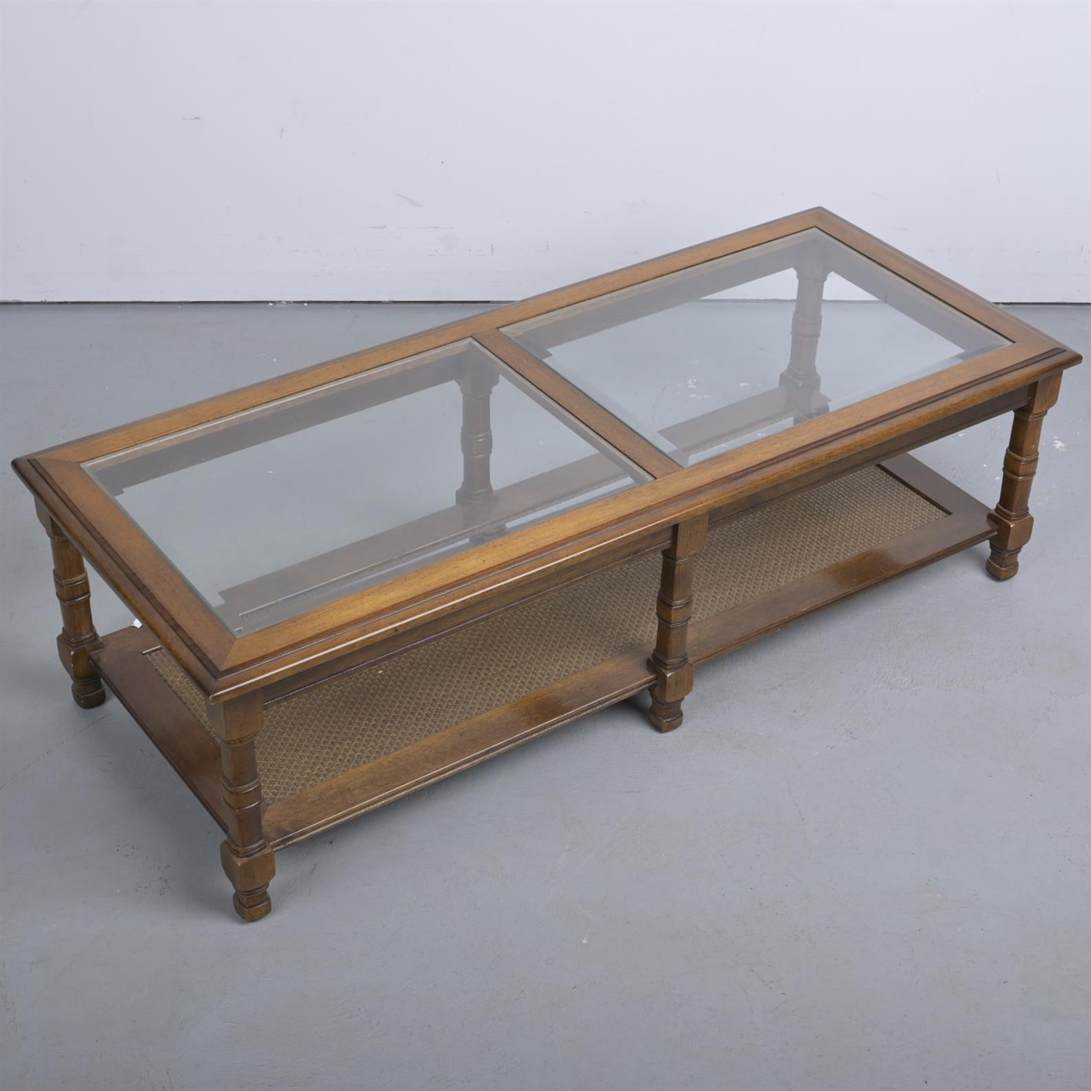 A GLASS TOPPED COFFEE TABLE WITH LOWER WOVEN CANE SHELF (38H X 129W X 53D CM)