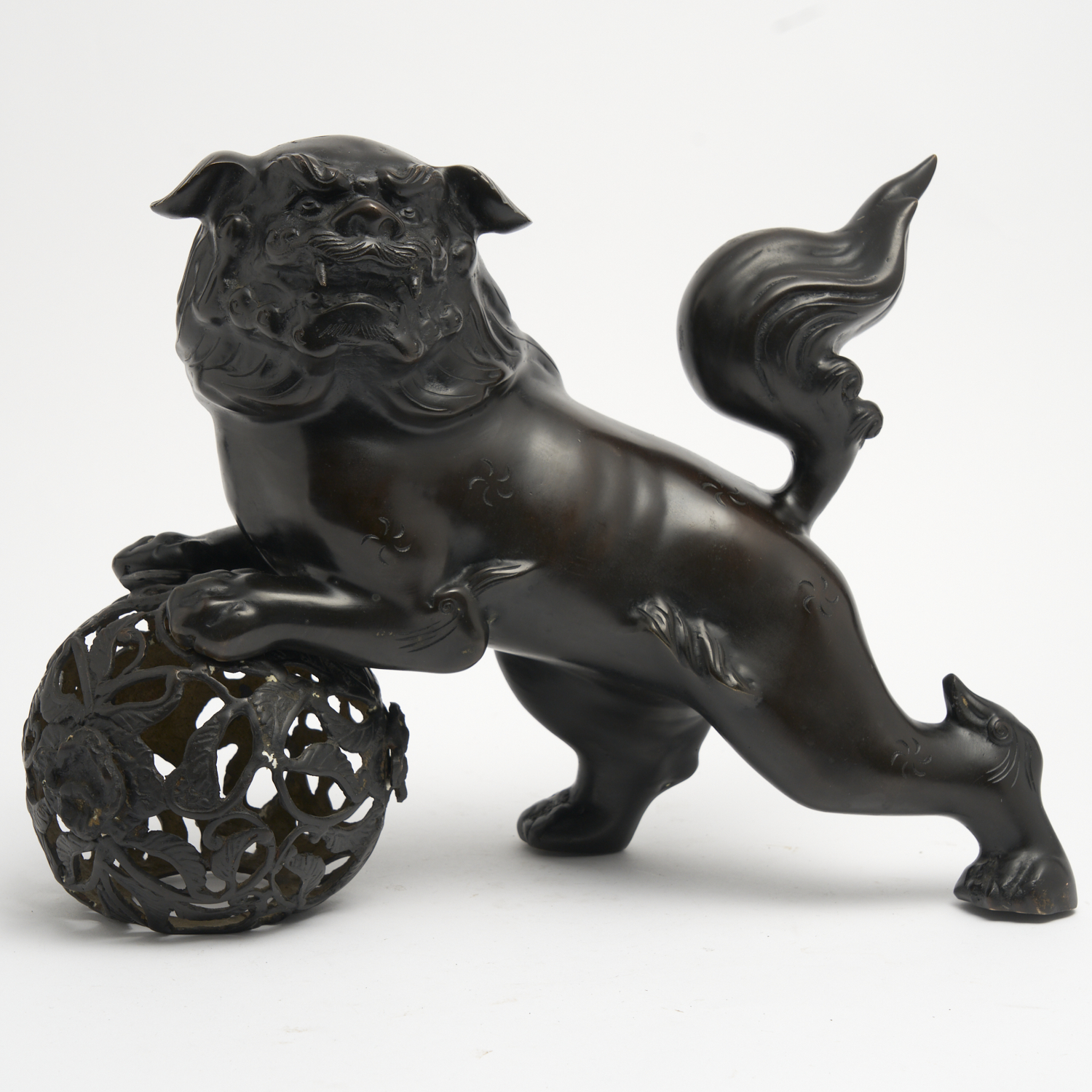 A VINTAGE CHINESE SOLID BRONZE FOO LION ON BALL FIGURE