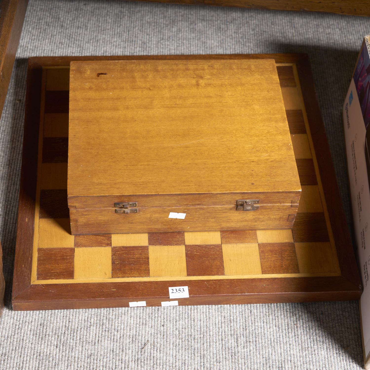 A MAHOGANY AND SILVER ASH CHESS SET WITH INTERESTING HANDWRITTEN LETTER OF MANUFACTURING PROVENANCE (A/F MISSING ONE KING) W.46CM (BOARD)