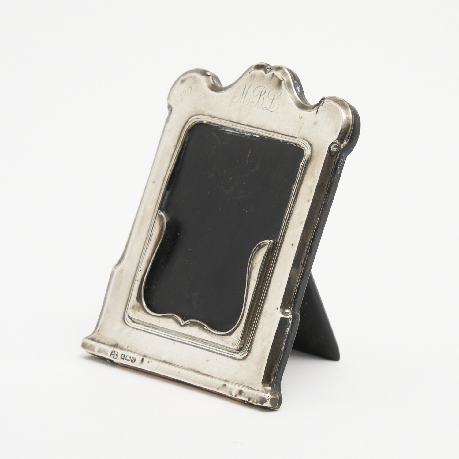 AN ENGLISH HALLMARKED STERLING SILVER WOODEN BACKED PHOTO FRAME, DATED 1917 H.12CM