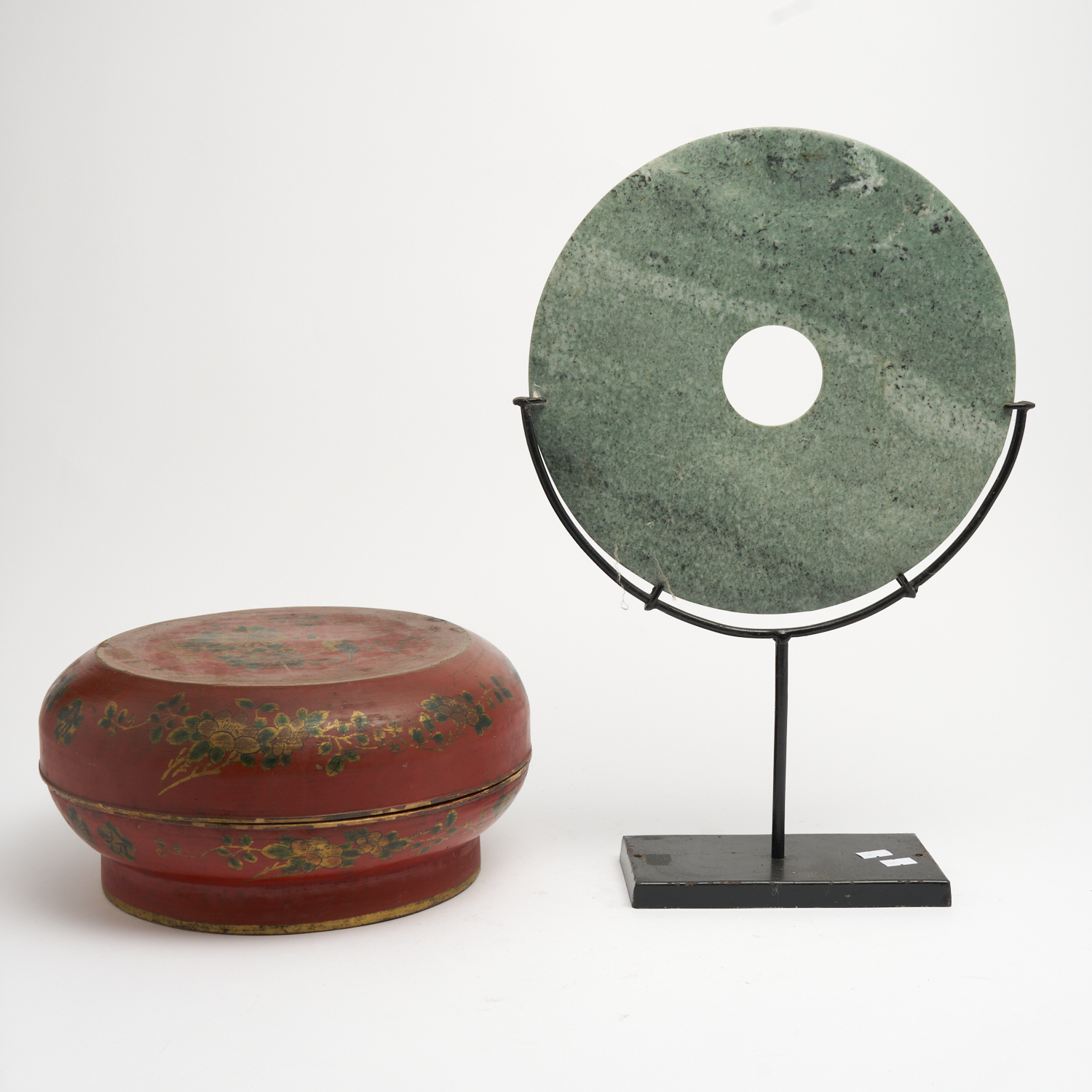 A CHINESE CIRCULAR LACQUERED BOX TOGETHER WITH A CIRCULAR HARDSTONE DISK ON STAND H29CM (TALLEST)